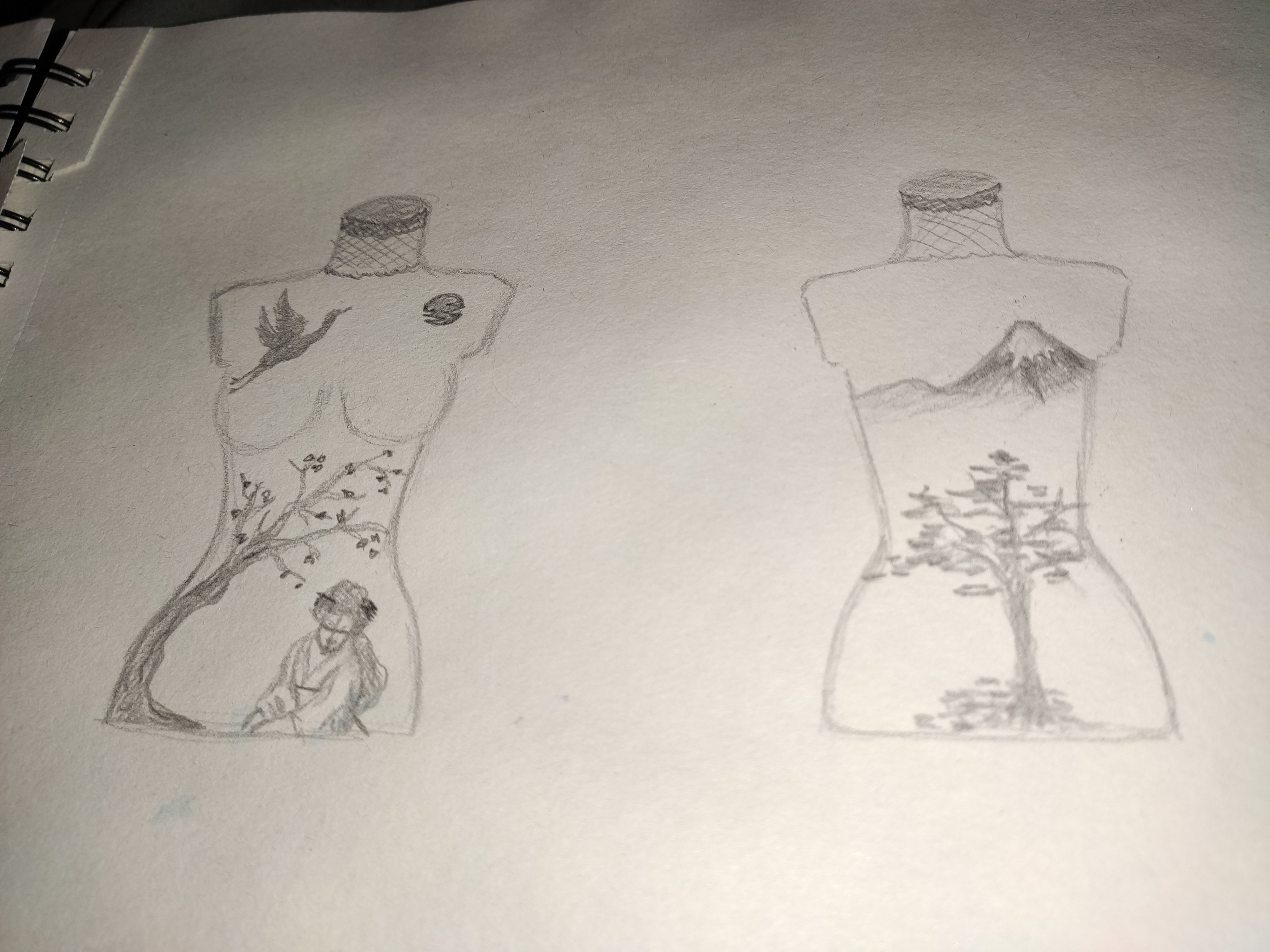 Les motifs seront tous réalisés à la peinture dorée, avec peut être des ajouts de feuille d’or… Je verrais au fil de sa réalisation. Bientôt de nouvelles photos. En attendant je vous laisse découvrir les croquis que j’ai réalisé hier soir pour préparer mon projet.