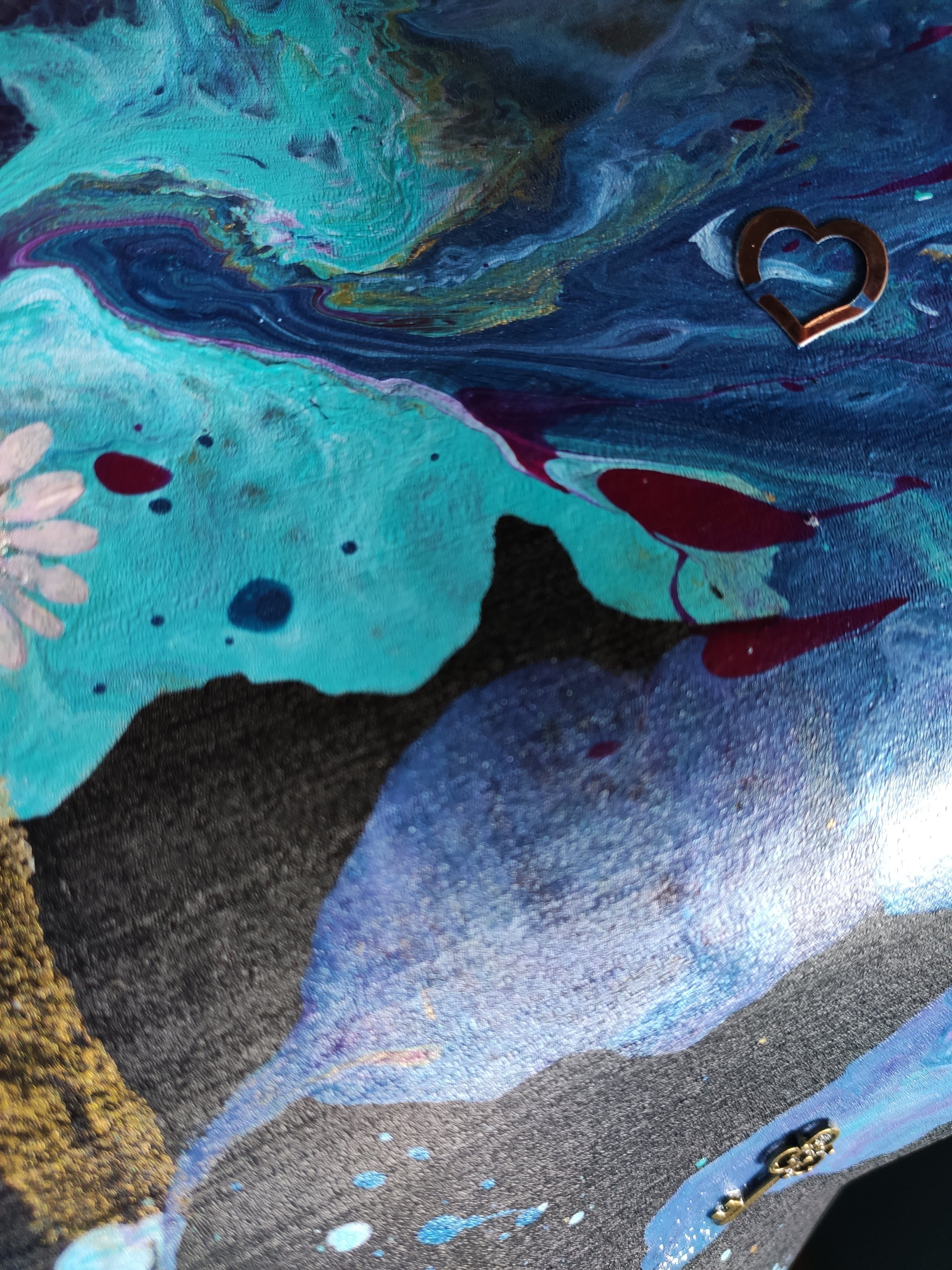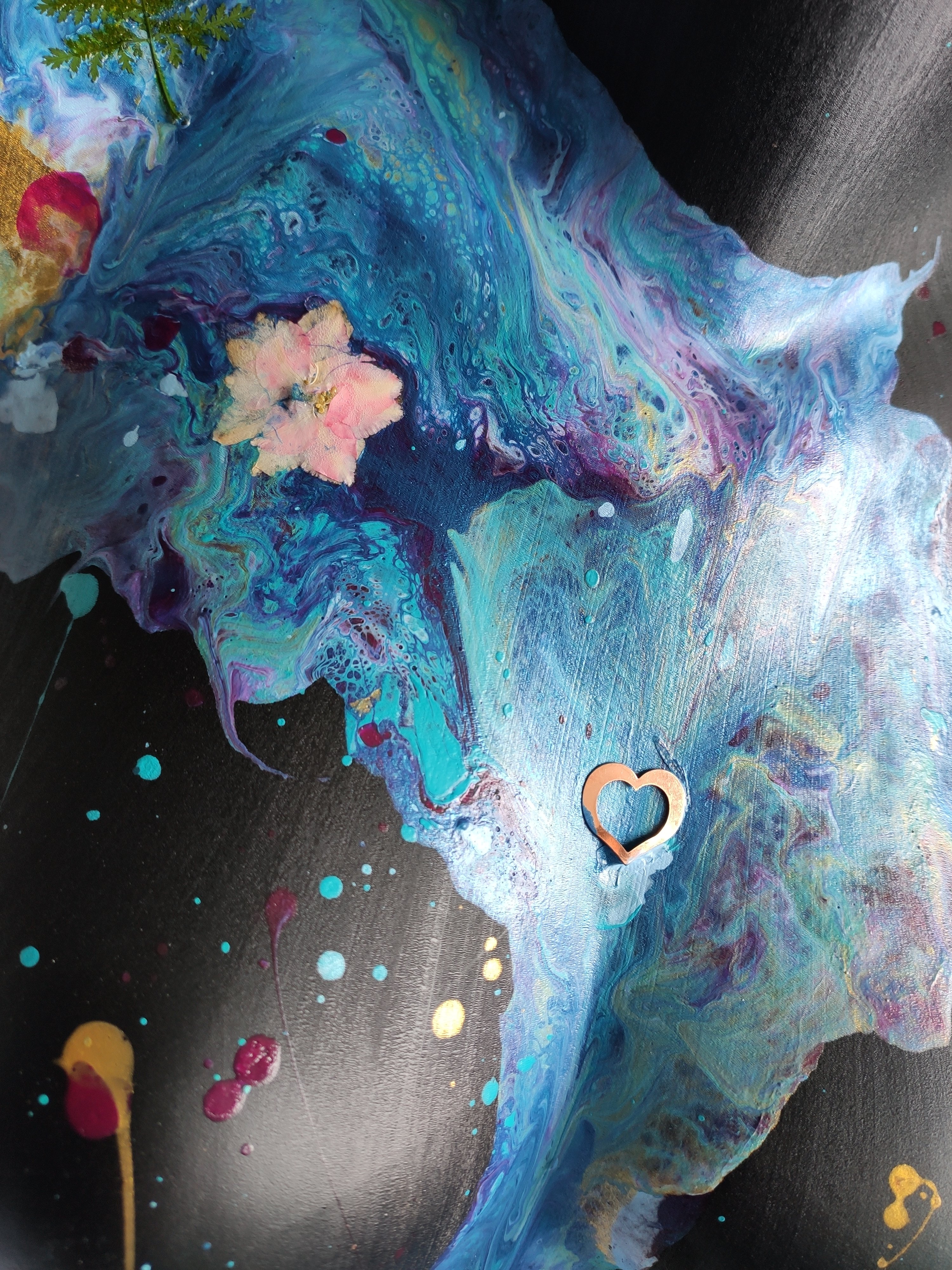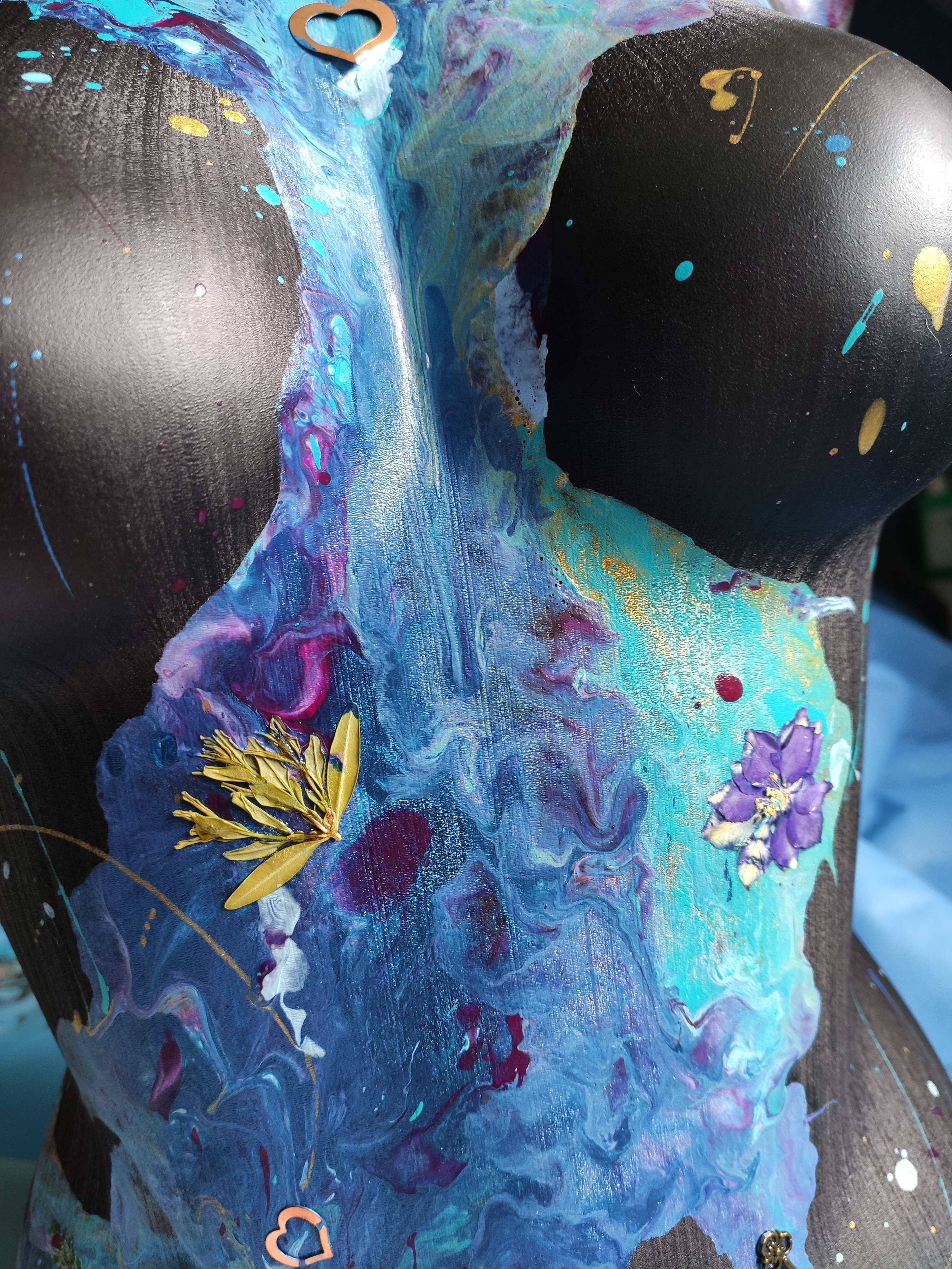 Premières étapes du nouveau buste déco au style plus doux et floral. Réalisation du motif principal en peinture fluide (pouring) avec ajout de fleurs séchées et de quelques motifs en métal qui seront intégrés avant séchage 🥰.