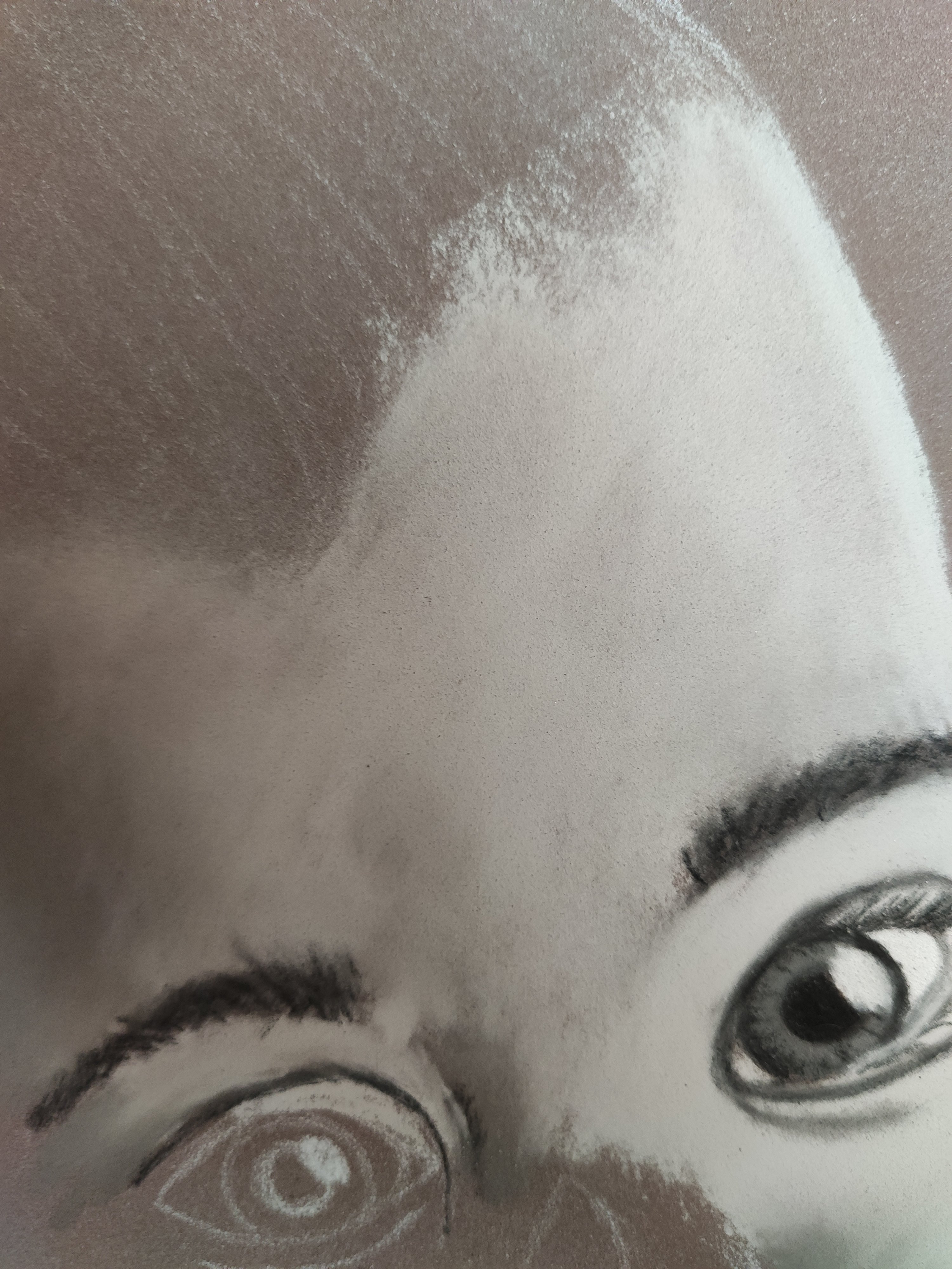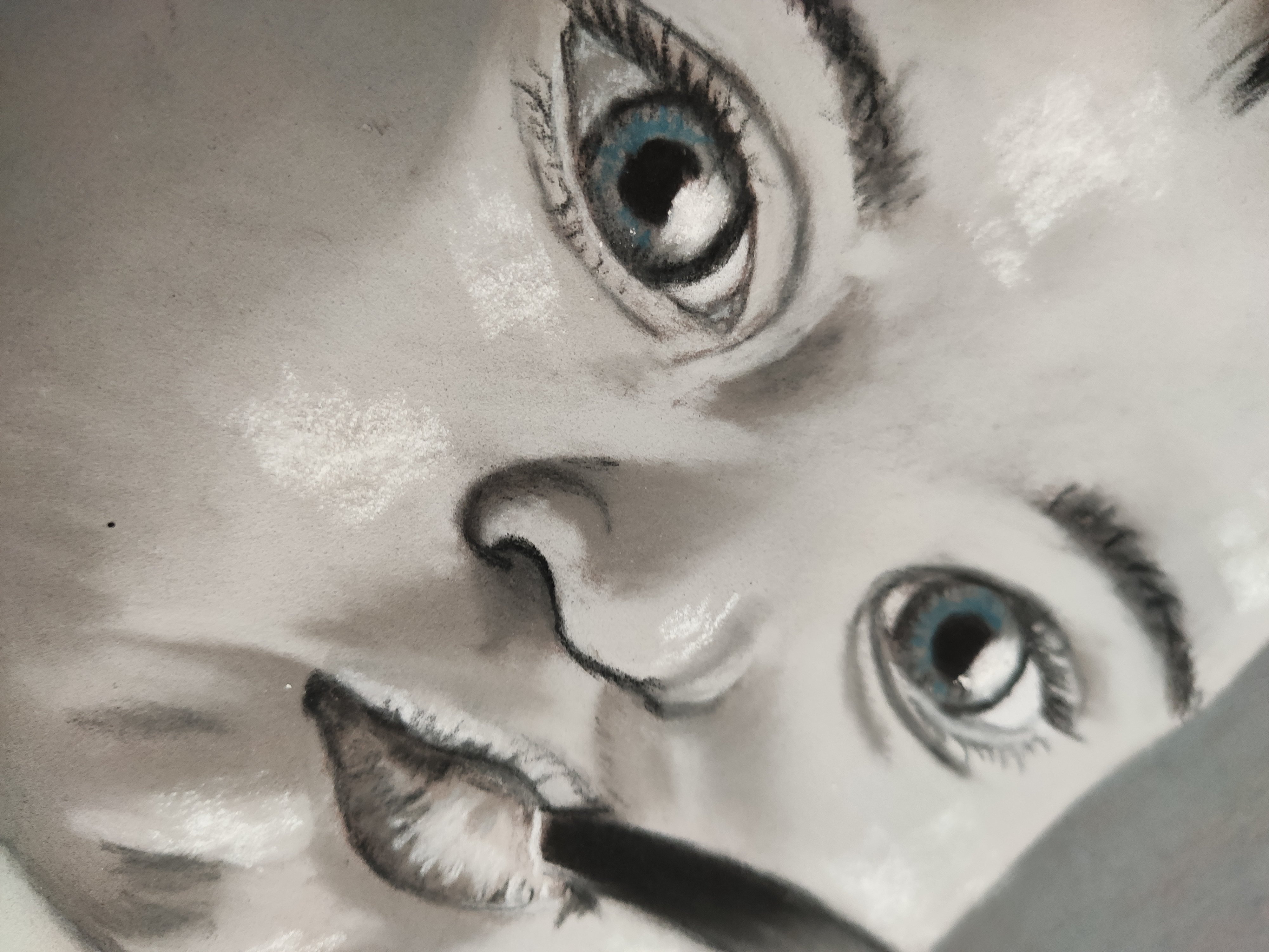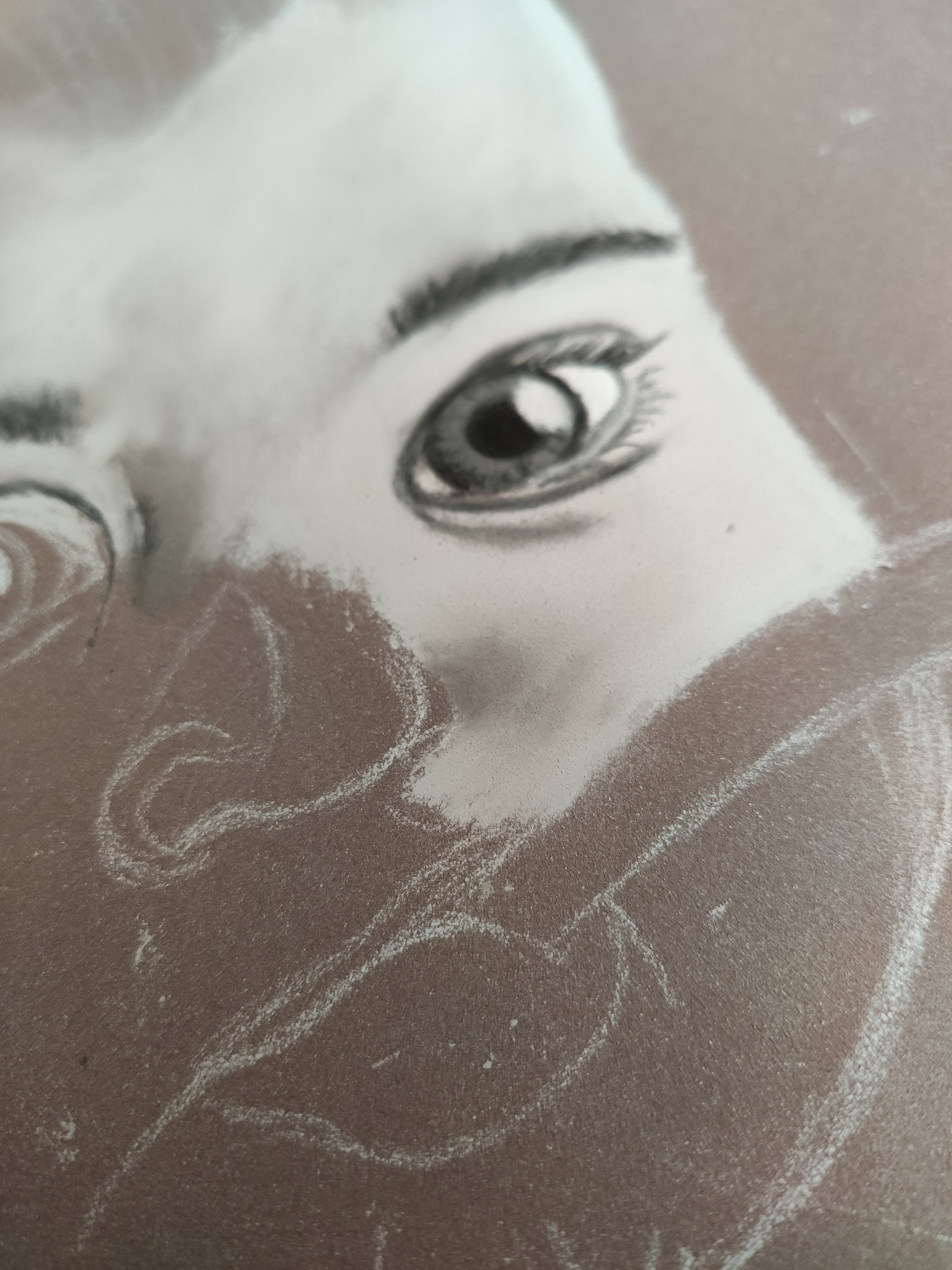 Dessin au crayon pastel blanc puis remplissage au pastel en bâton avec estompe au doigt et à l’estompe en feutrine. Une touche de bleu dans ses yeux et dans le fond.