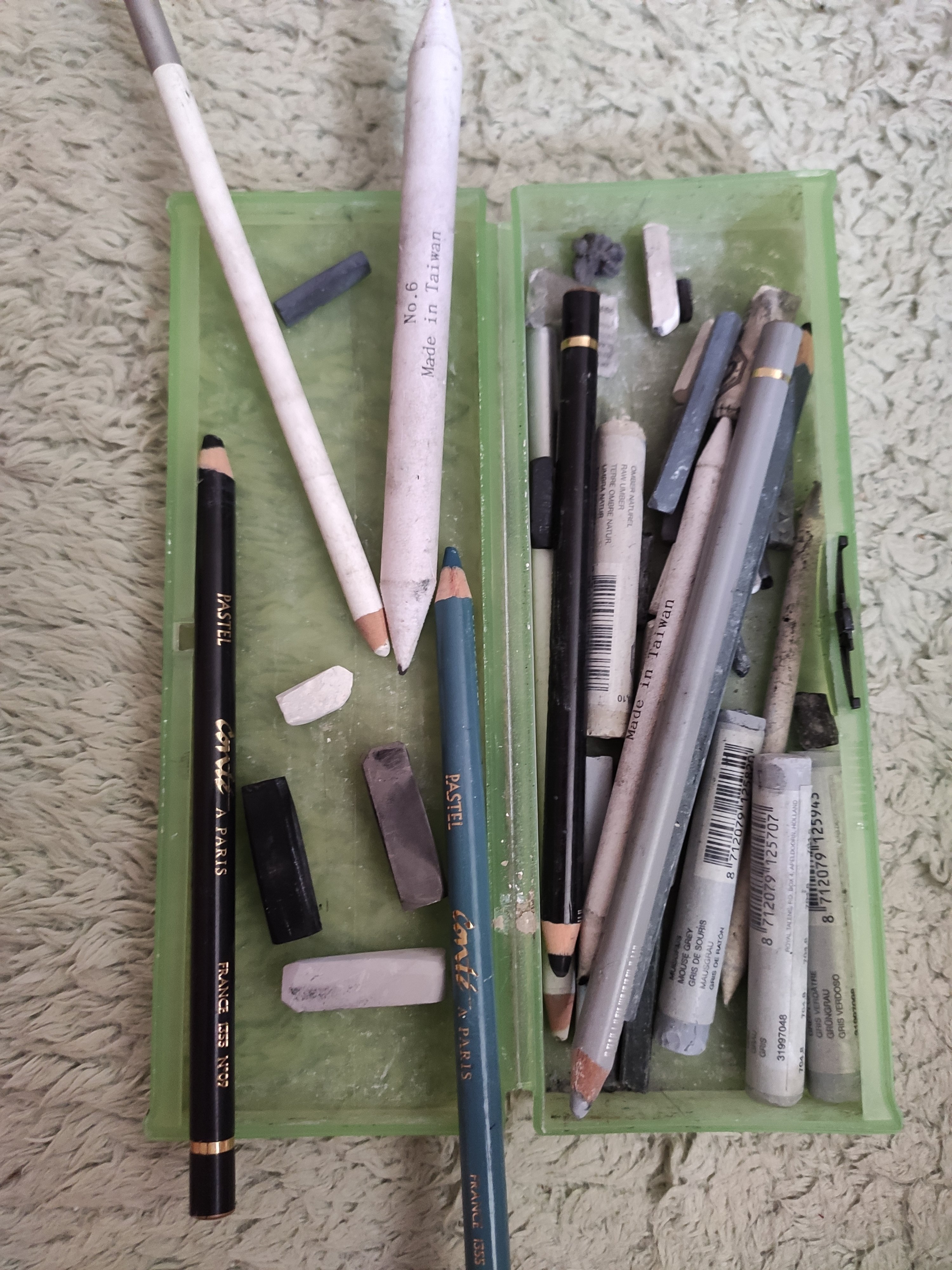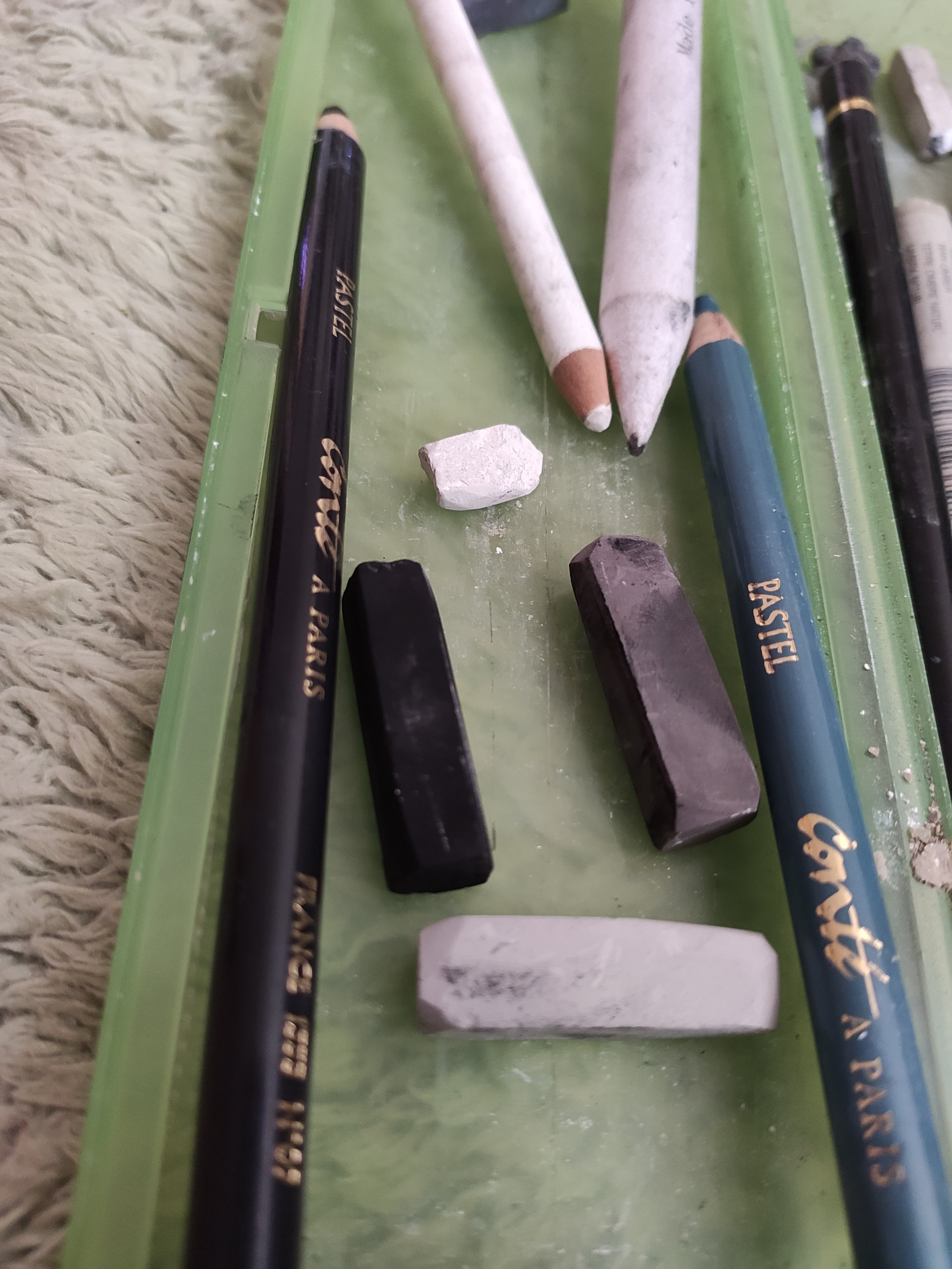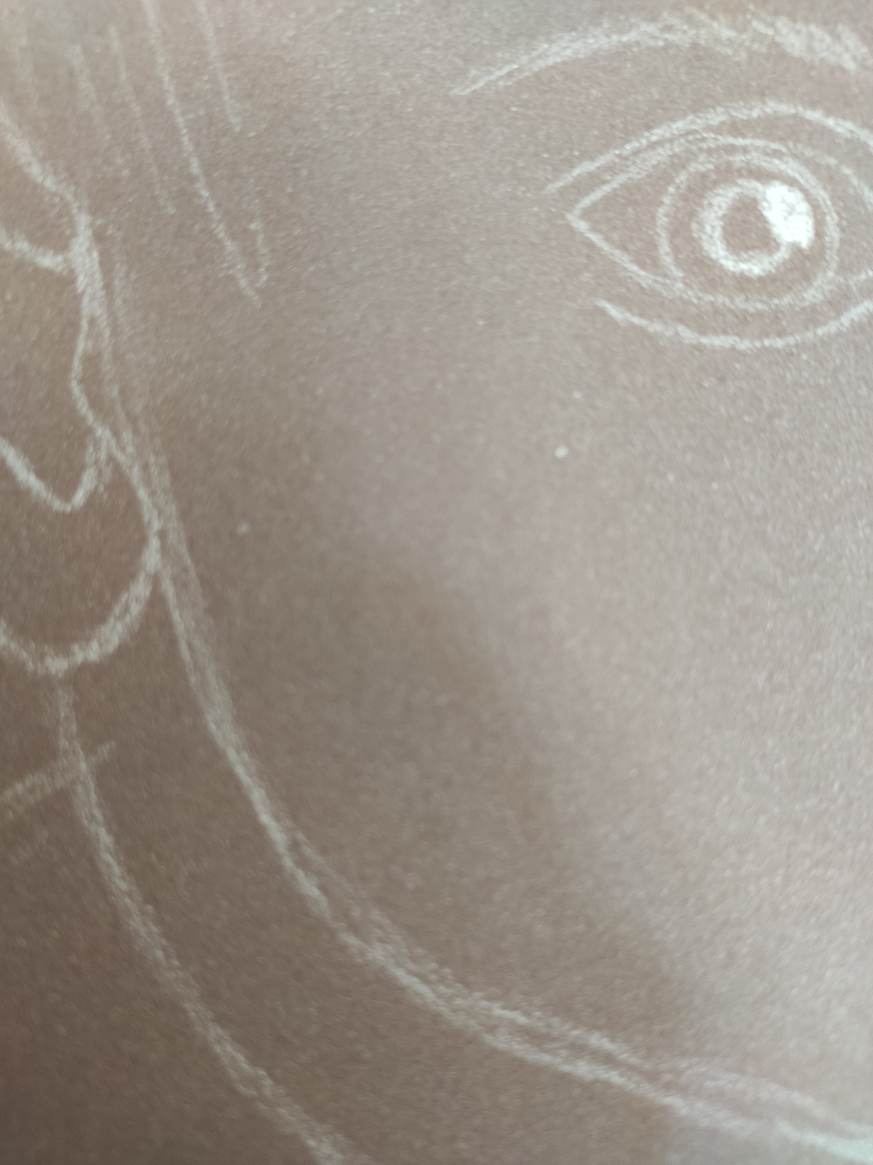 Dessin au crayon pastel blanc puis remplissage au pastel en bâton avec estompe au doigt et à l’estompe en feutrine. Une touche de bleu dans ses yeux et dans le fond.