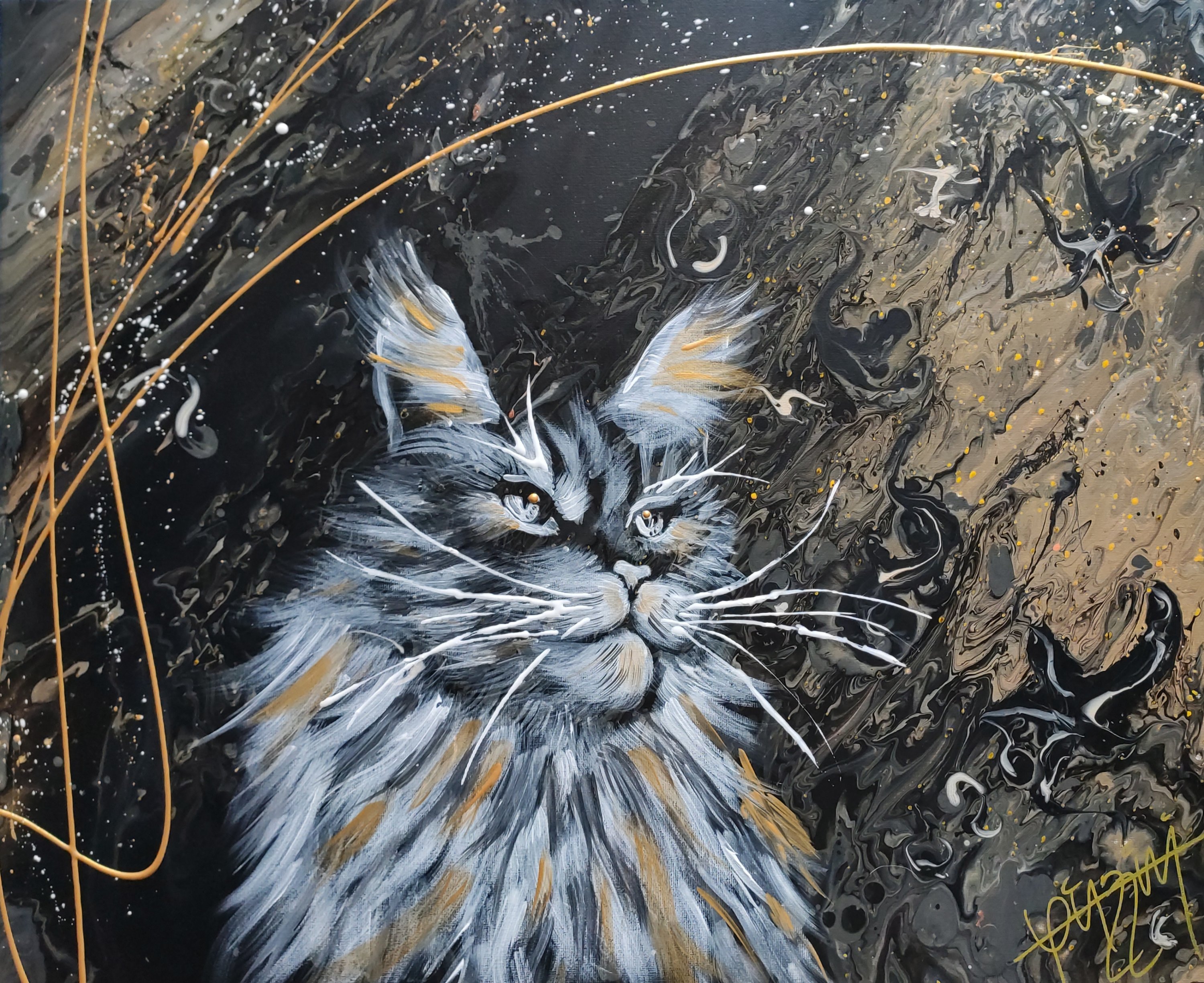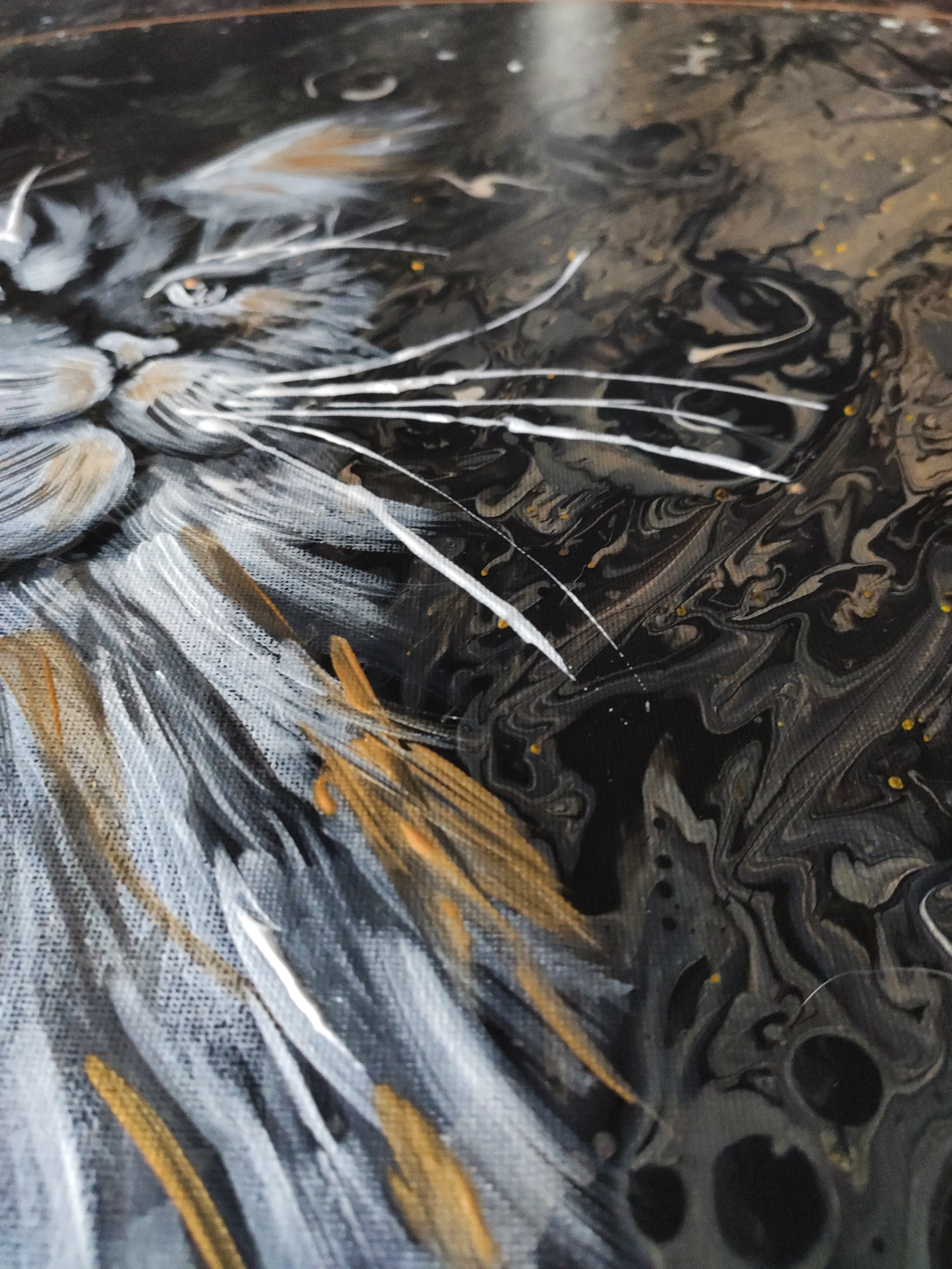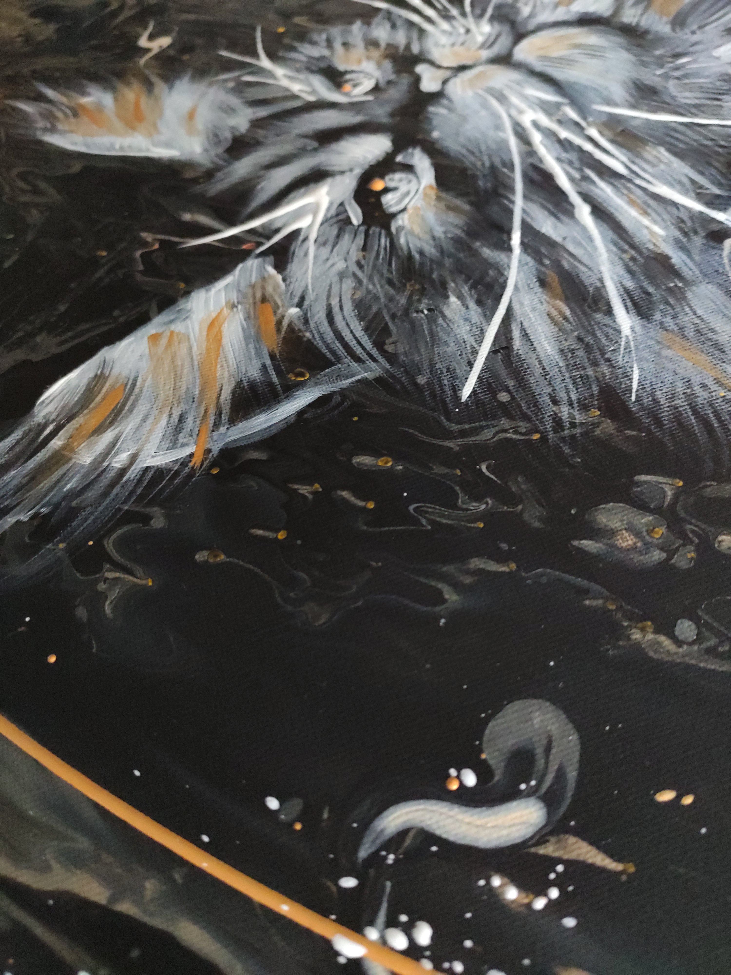 Après séchage complet du fond, le motif du chat est réalisé à main levée à la peinture blanche avec quelques touches de doré. 😉🐈