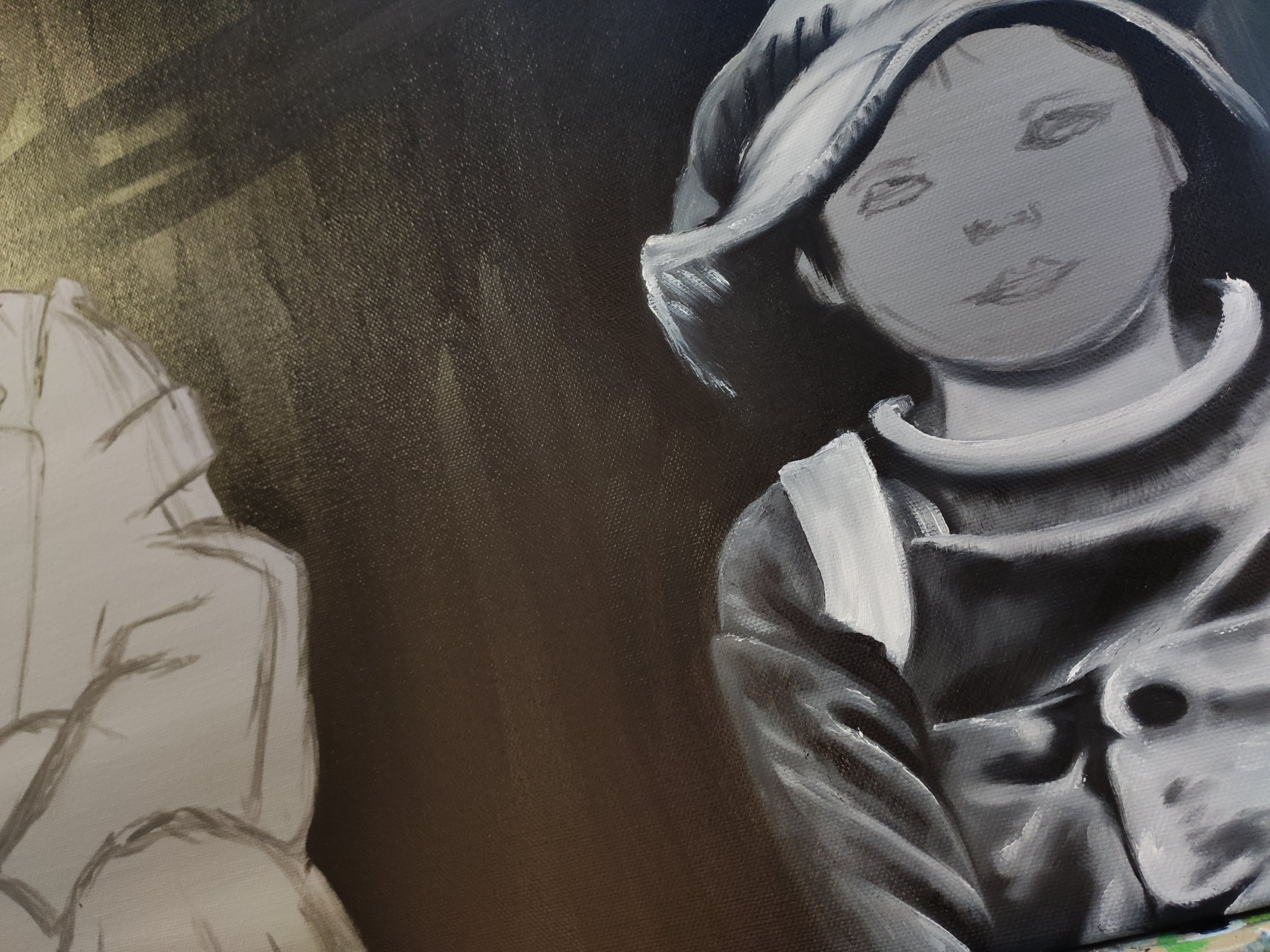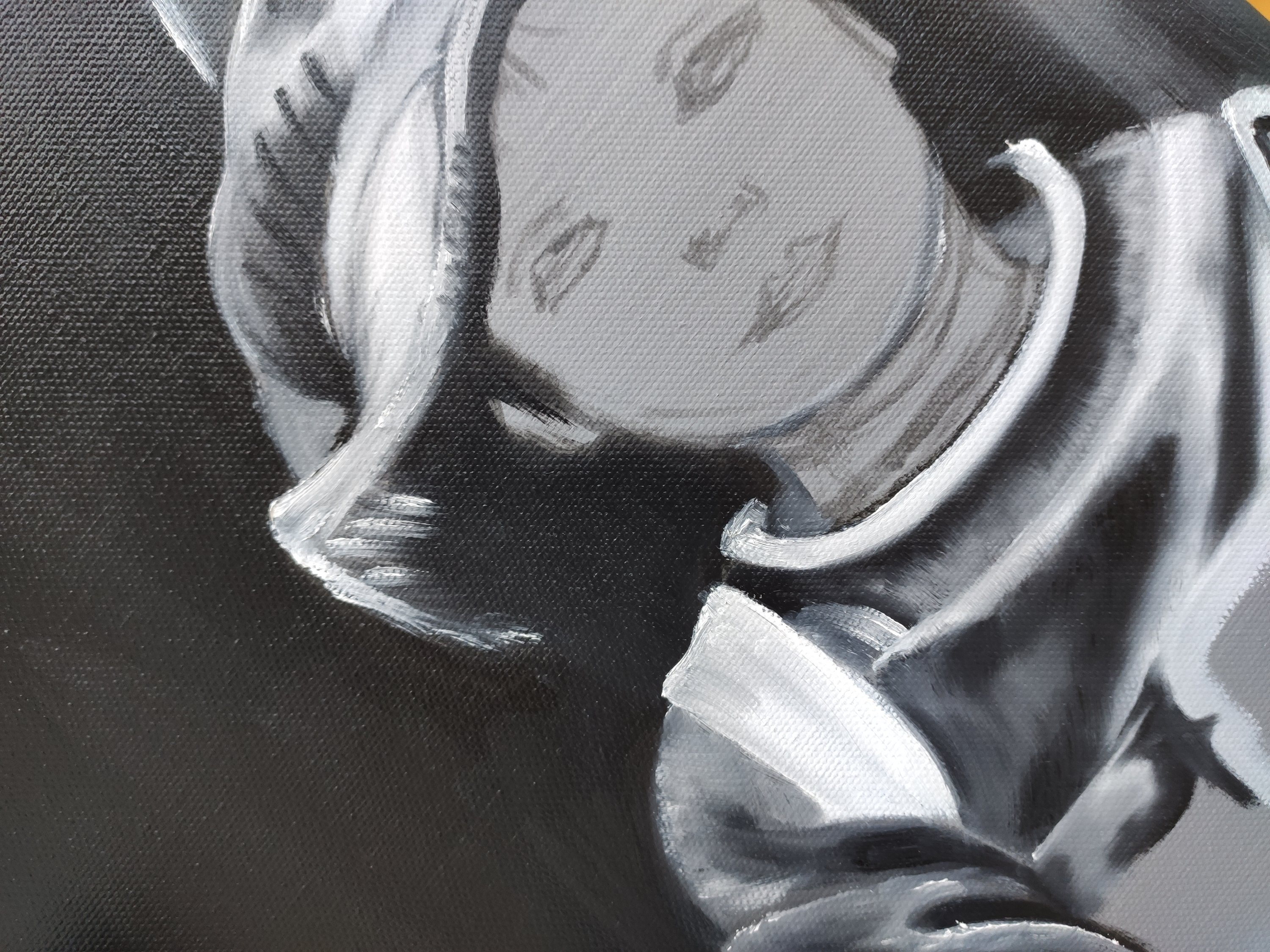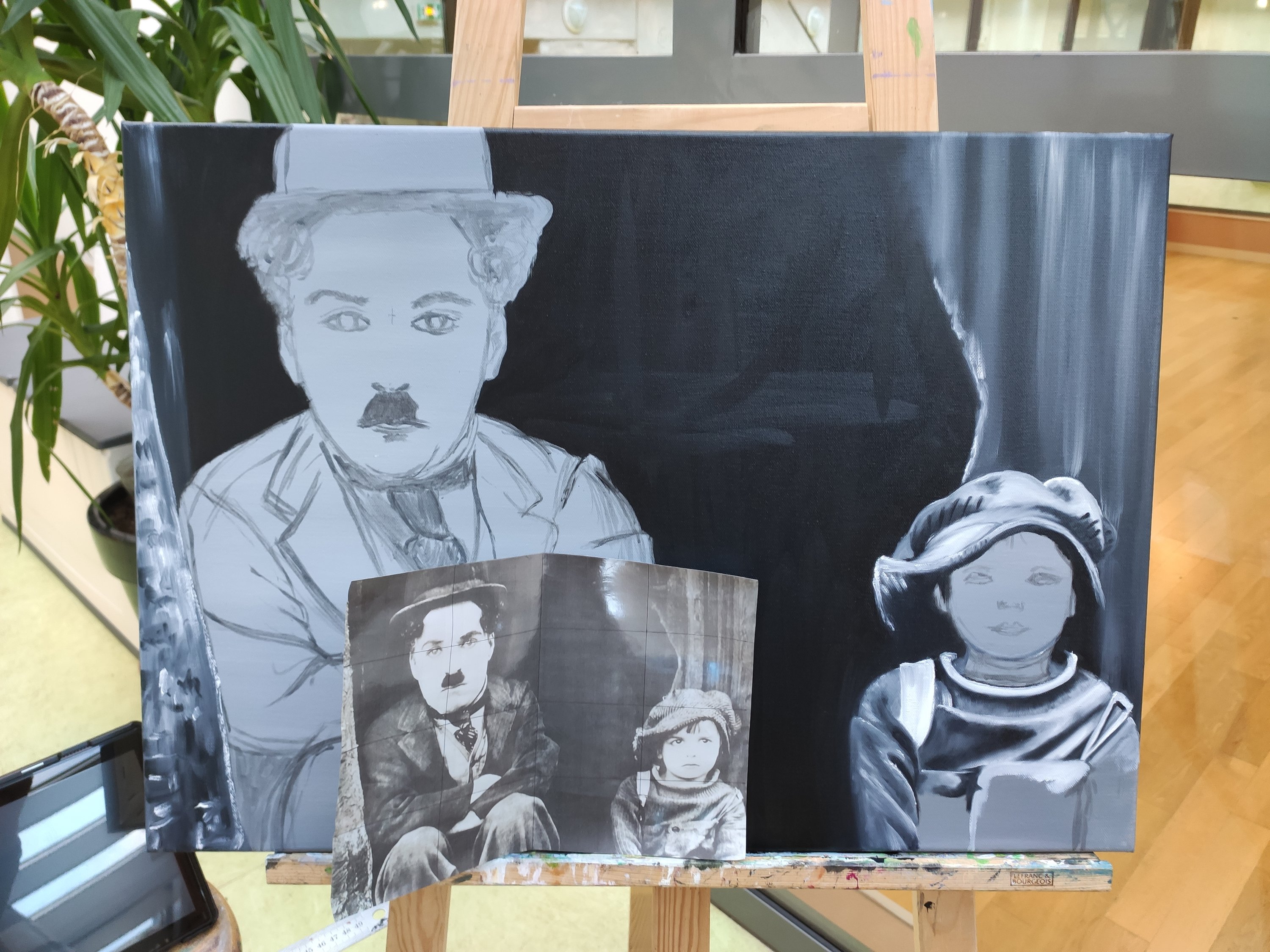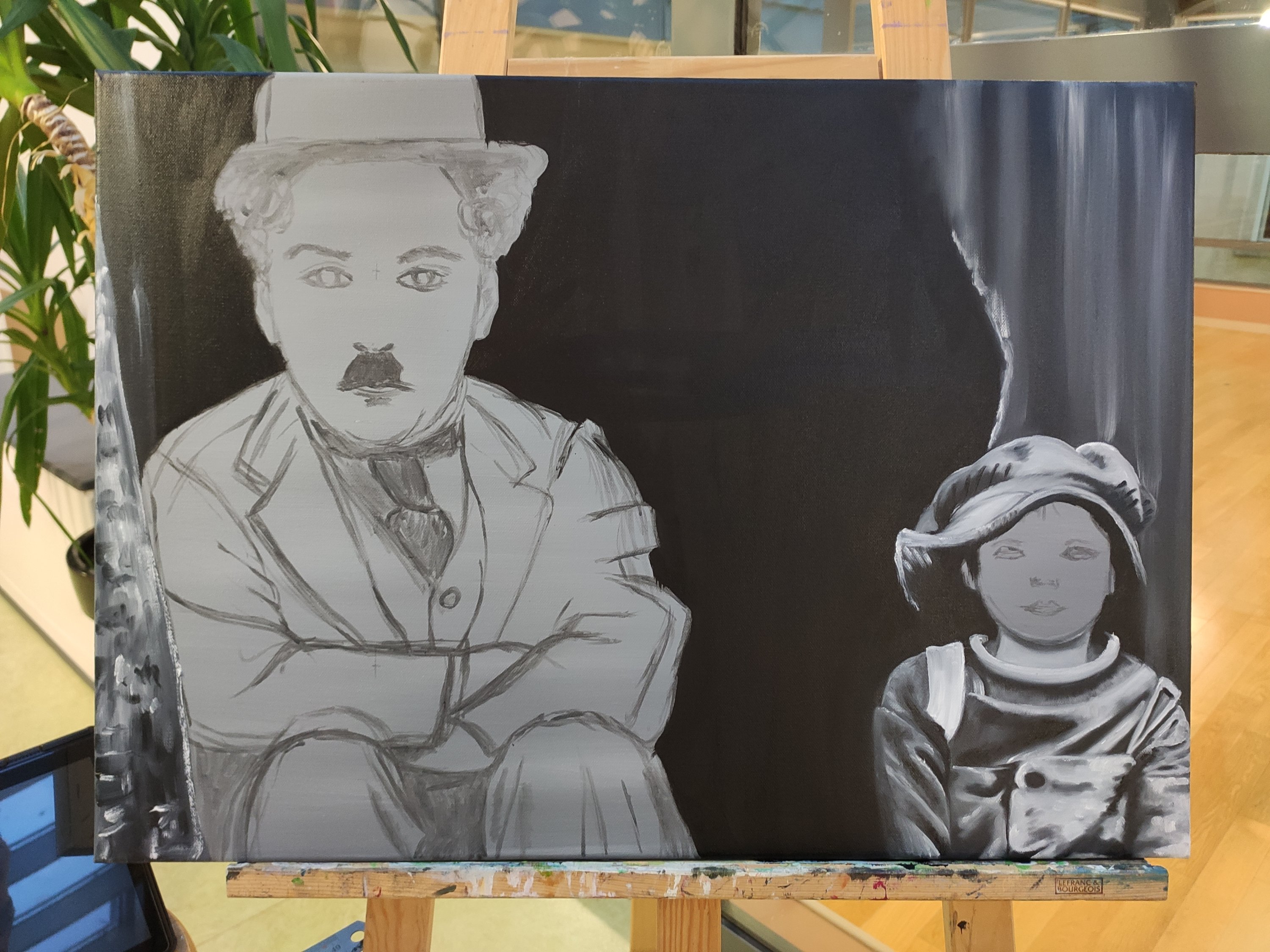 Cette nouvelle toile est réalisée à la peinture à l’huile. En noir et blanc, elle est un hommage à un grand acteur du cinéma muet du début du 20 ème.