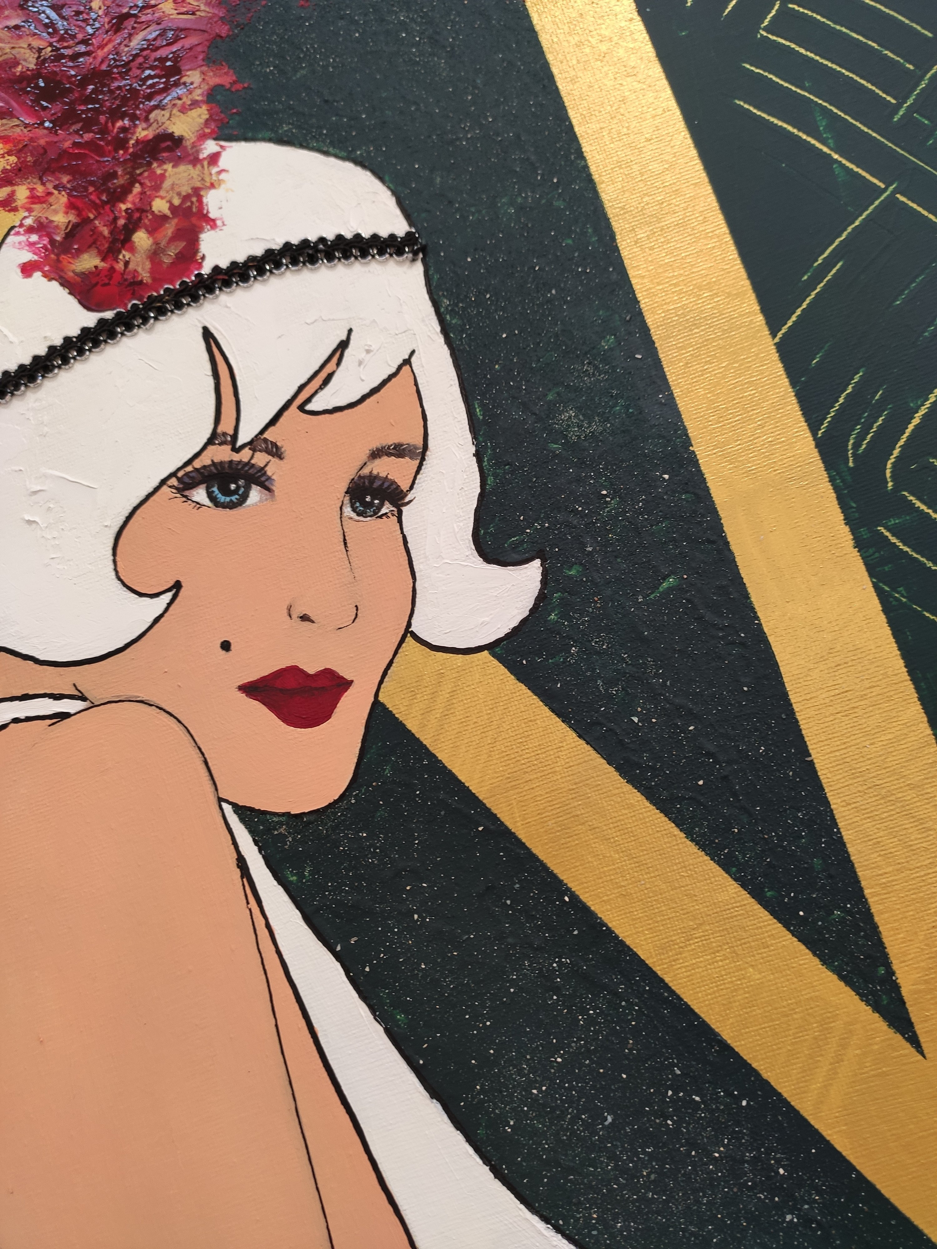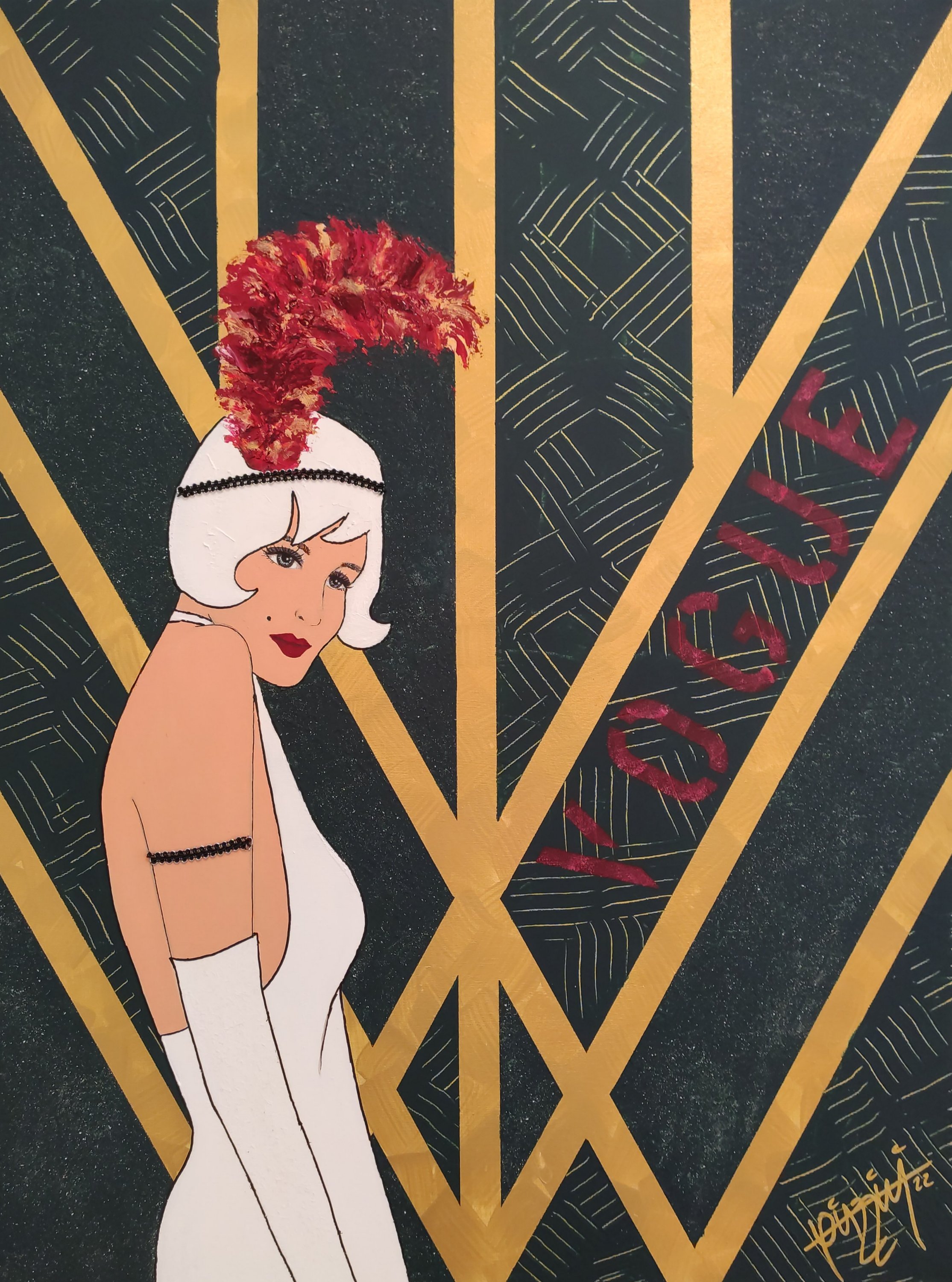 Après quelques retouches par ci par là, application d’un pochoir « VOGUE » et contour de ma Lady au marqueur Posca.