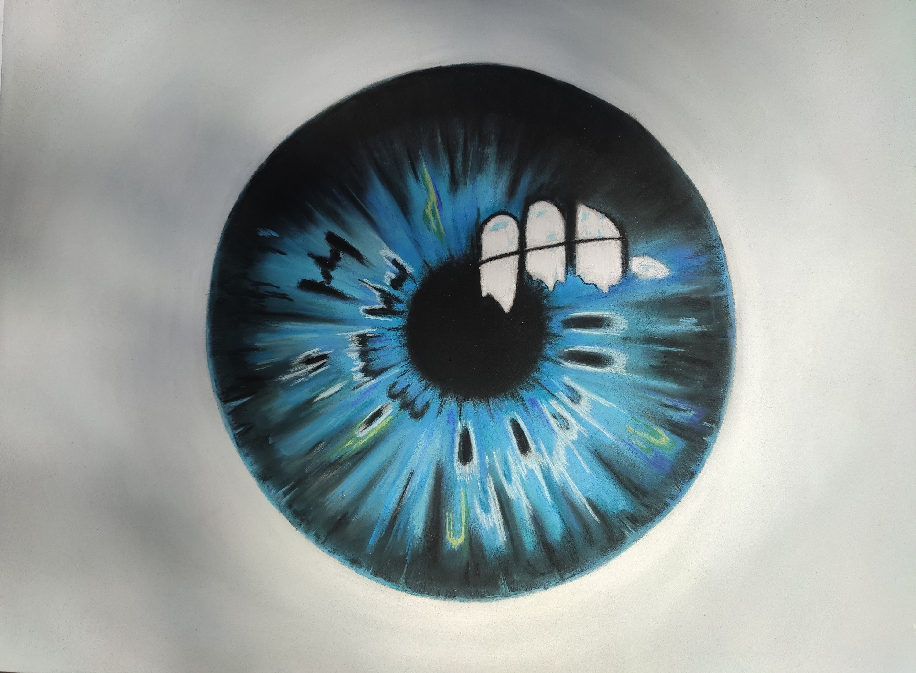 Ce pastel est centré sur l’iris. Une multitude de reflets et de nuances dans une parcelle d’humanité.
