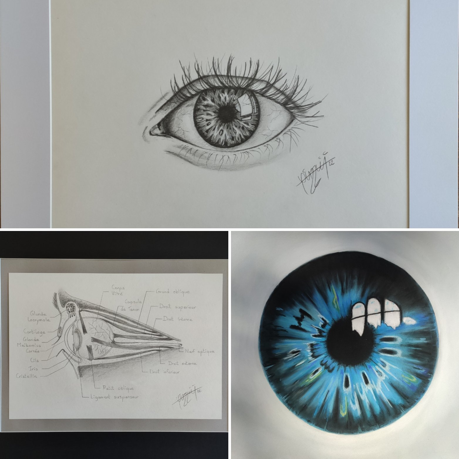 Trois oeuvres dont deux au graphite et une au Pastel tendre. L’étude du regard est passionnante et je pense en refaire sur ce thème ☺️.