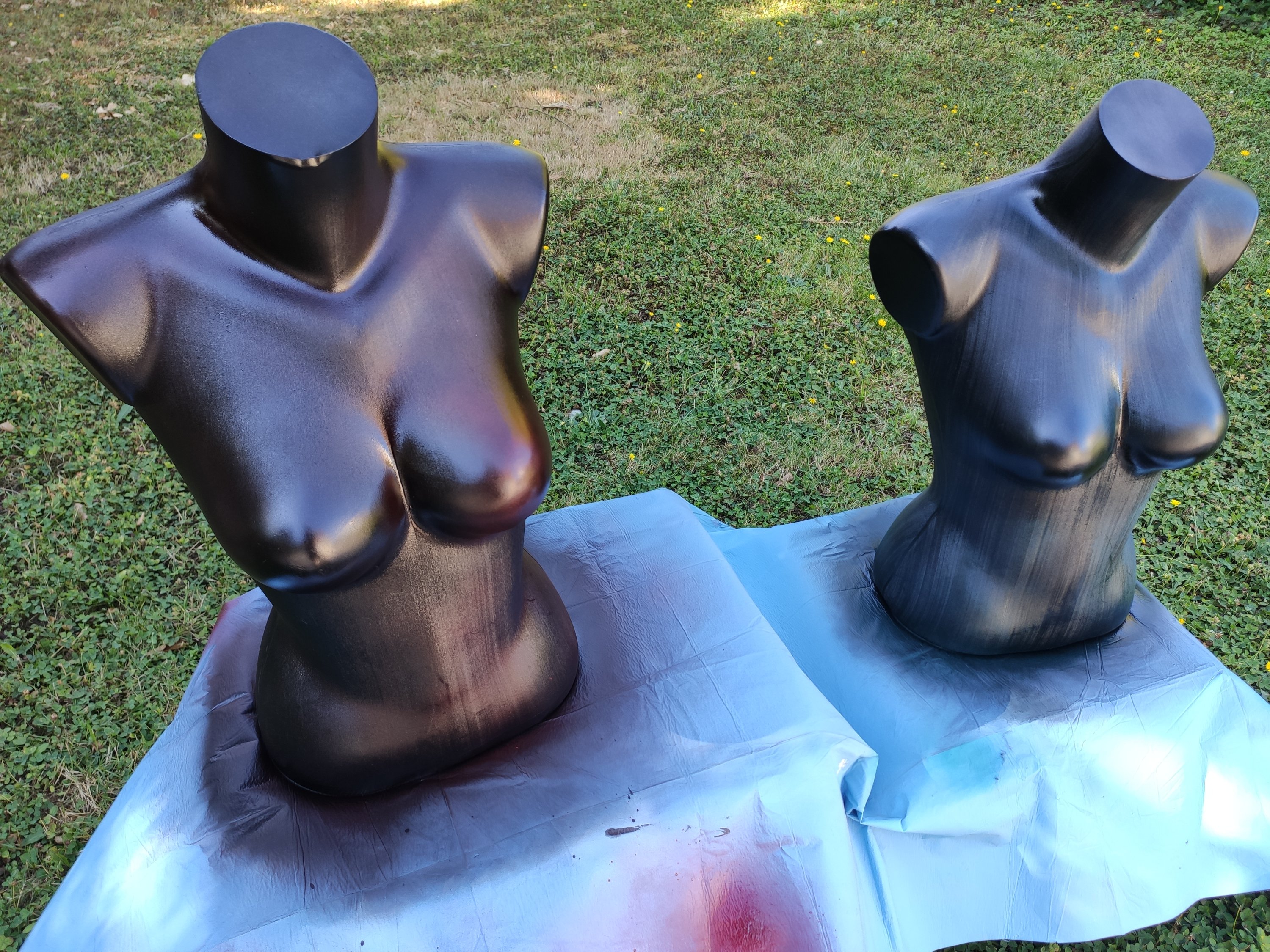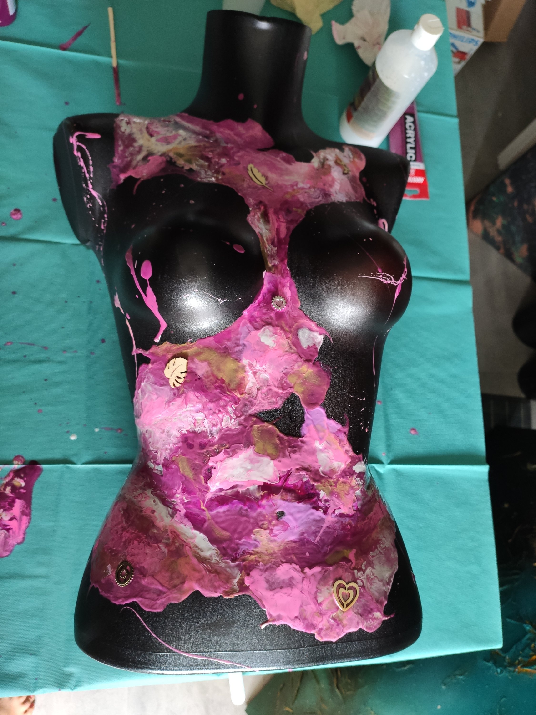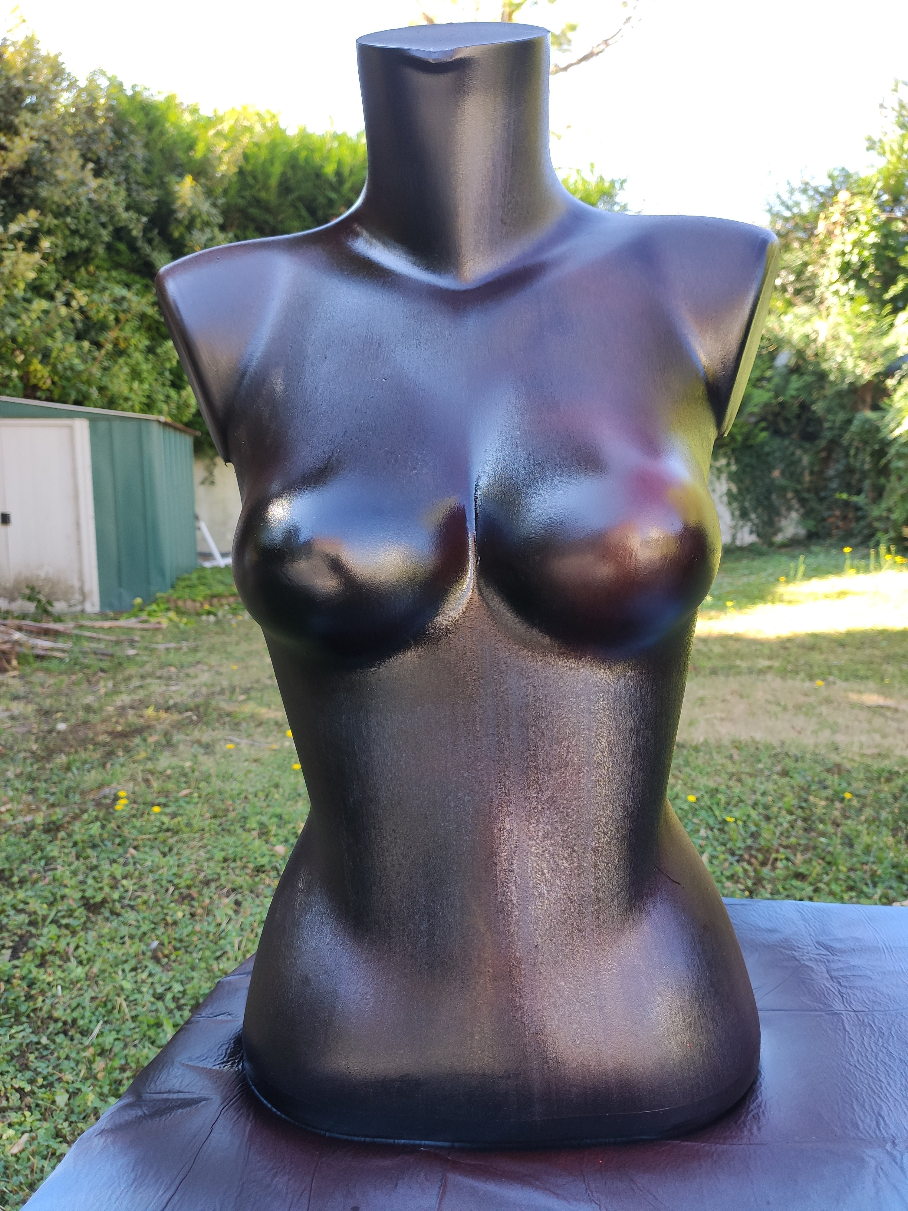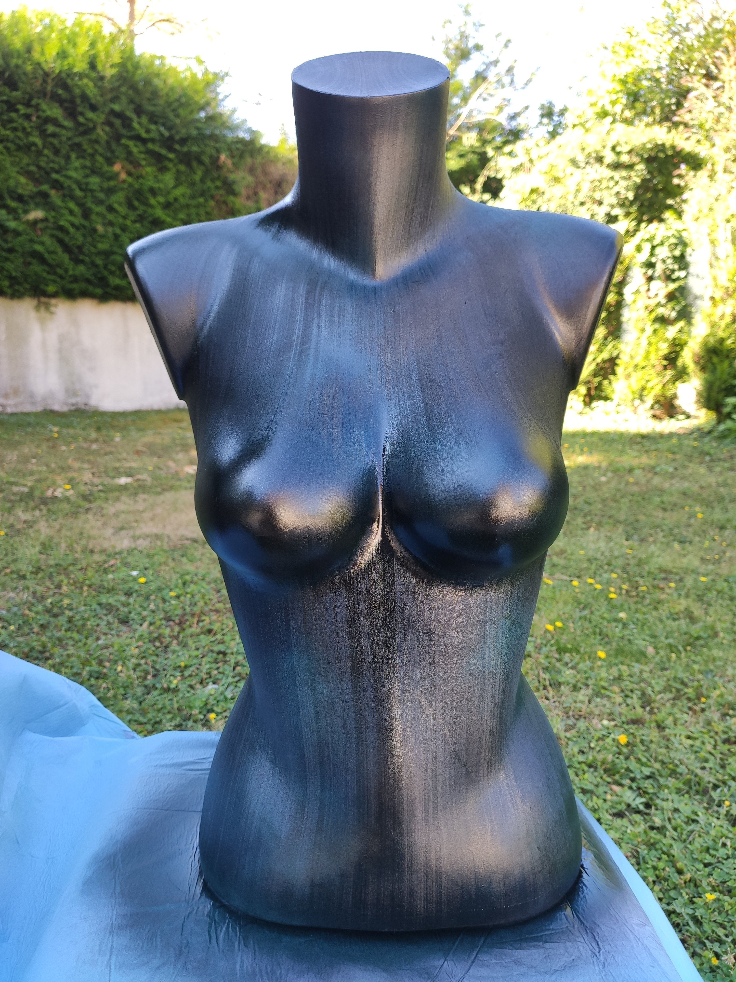 Après avoir repeint le fond de mes deux bustes en noir aux reflets rouges pour l’un et en noir aux reflets bleus pour l’autre, je m’attaque à la décoration du premier 💖.