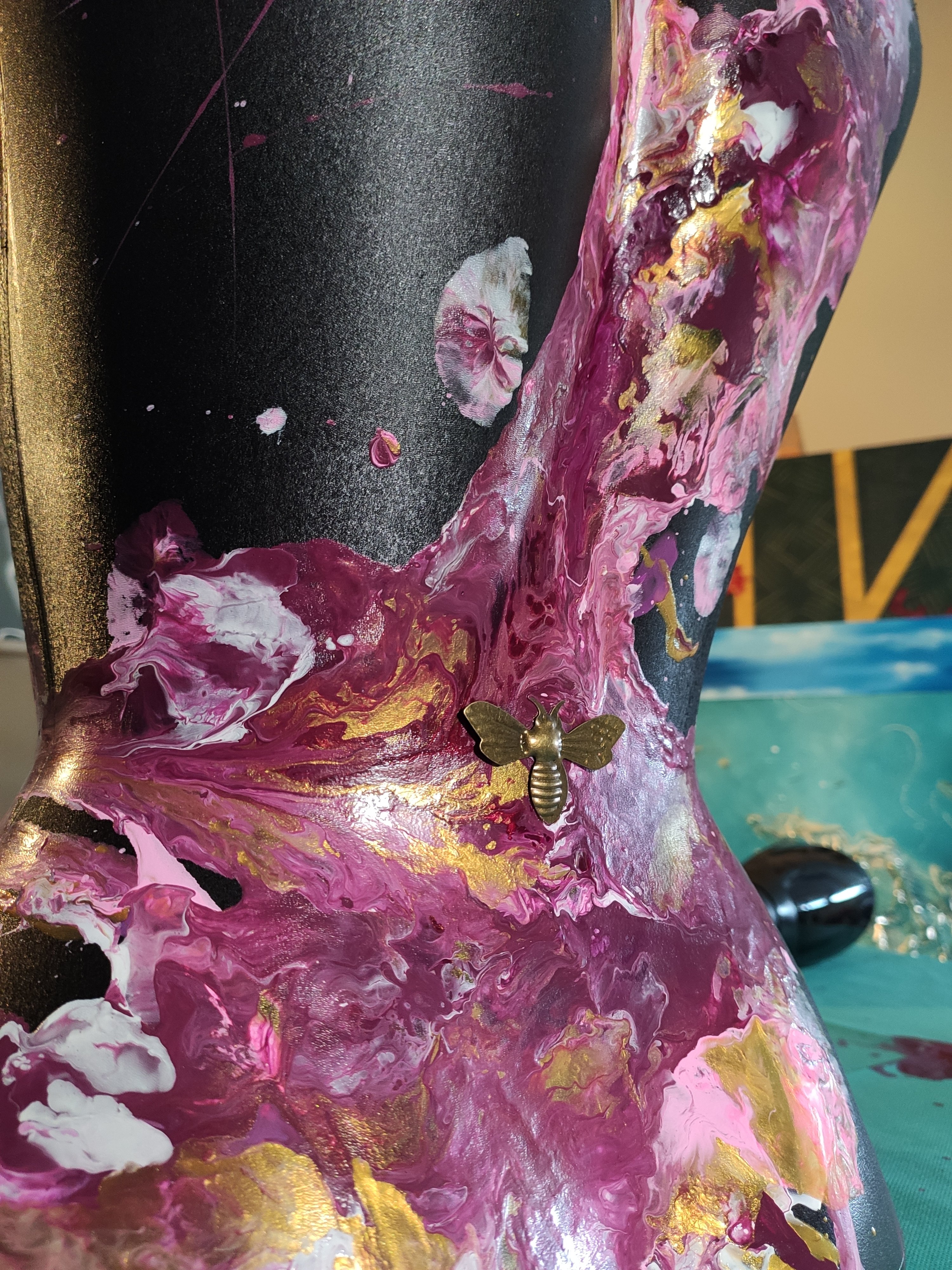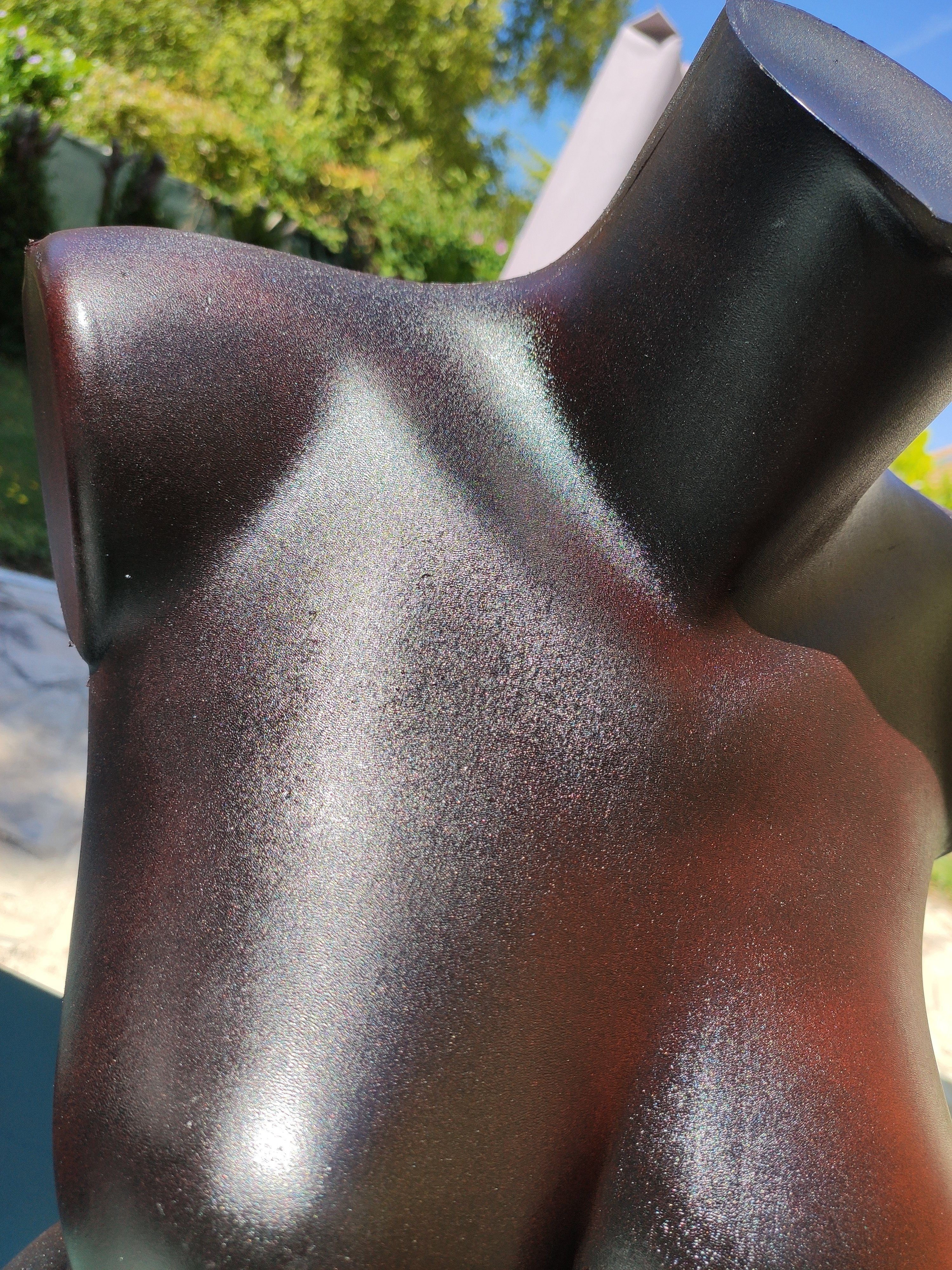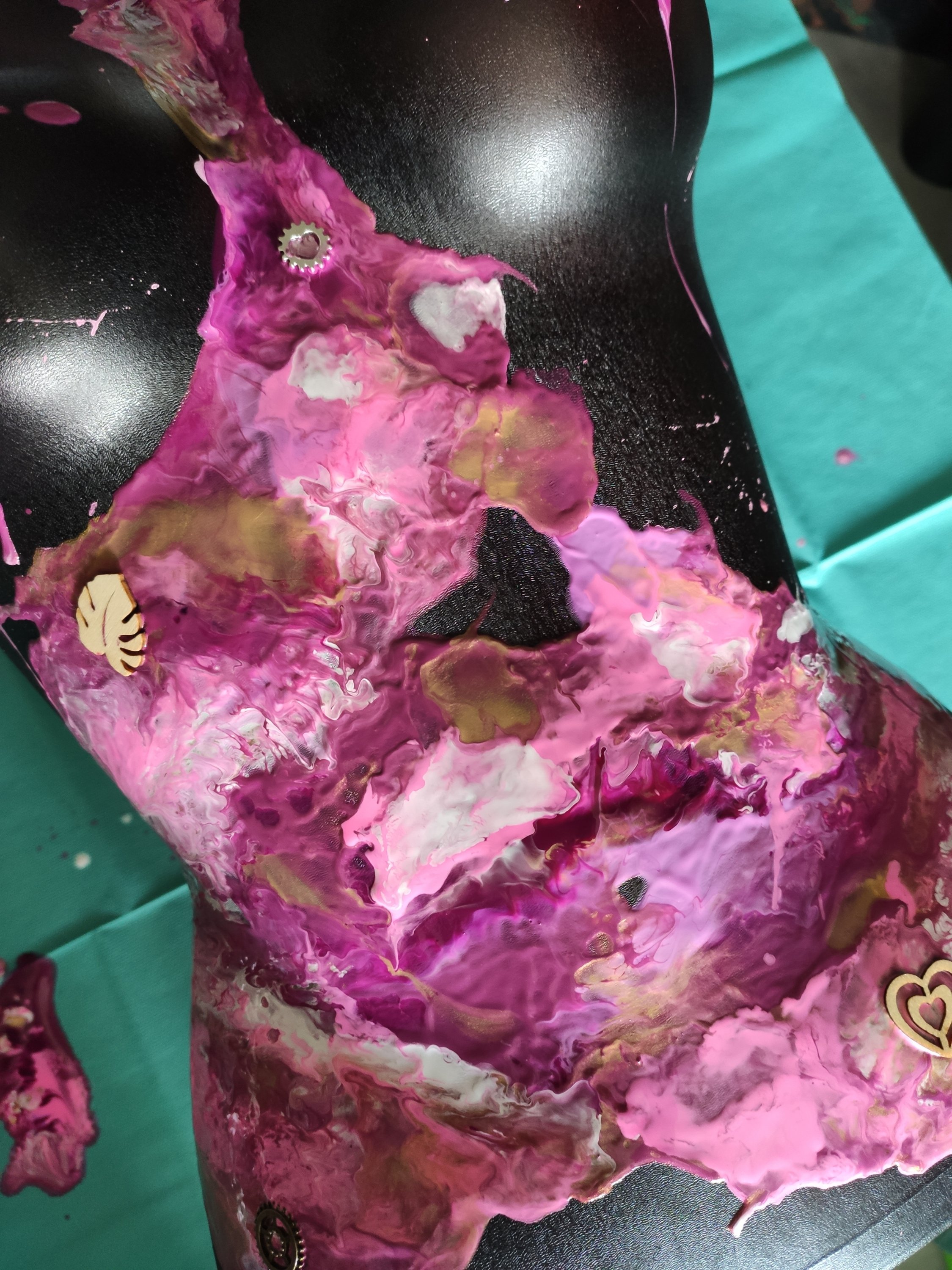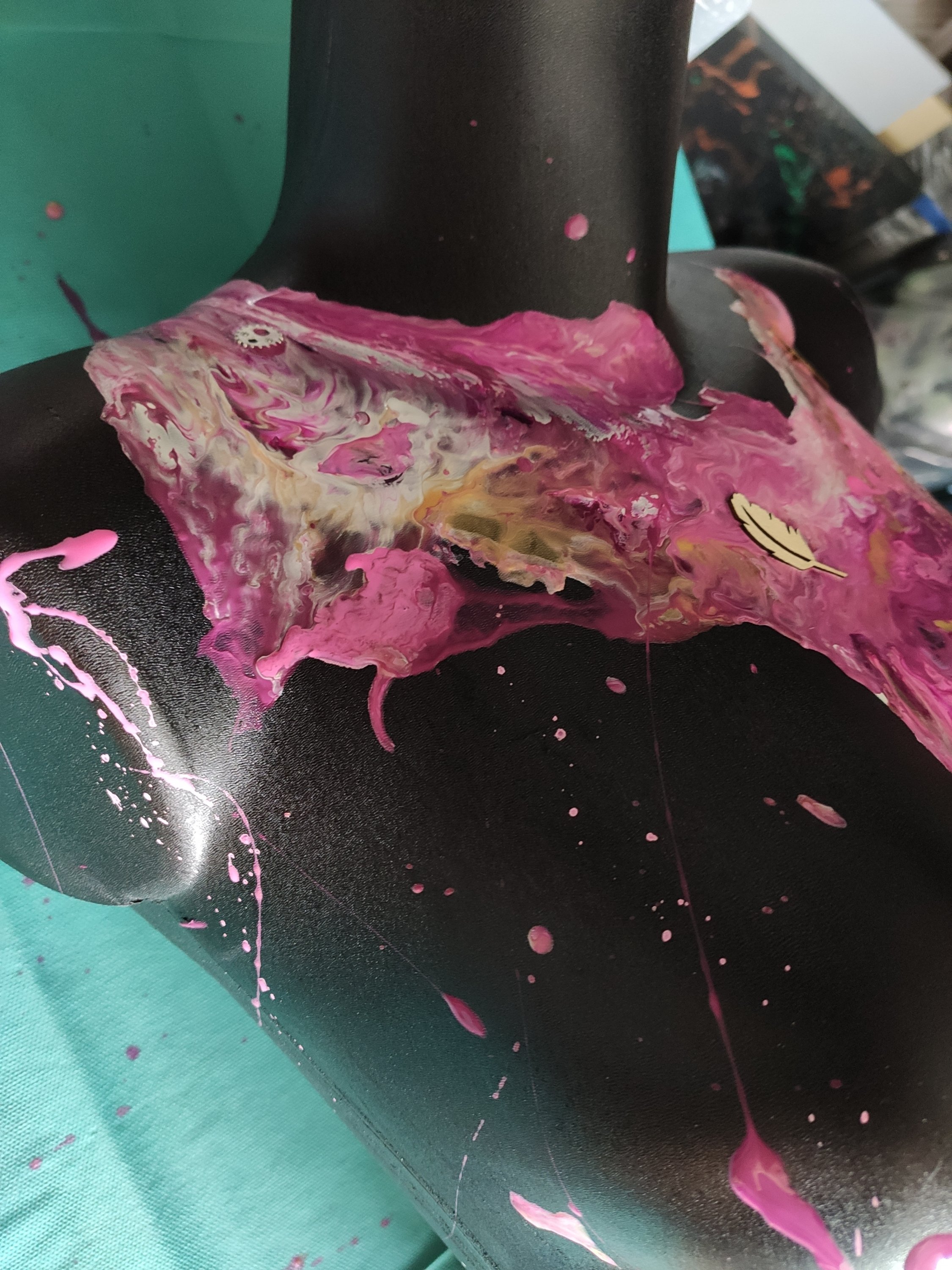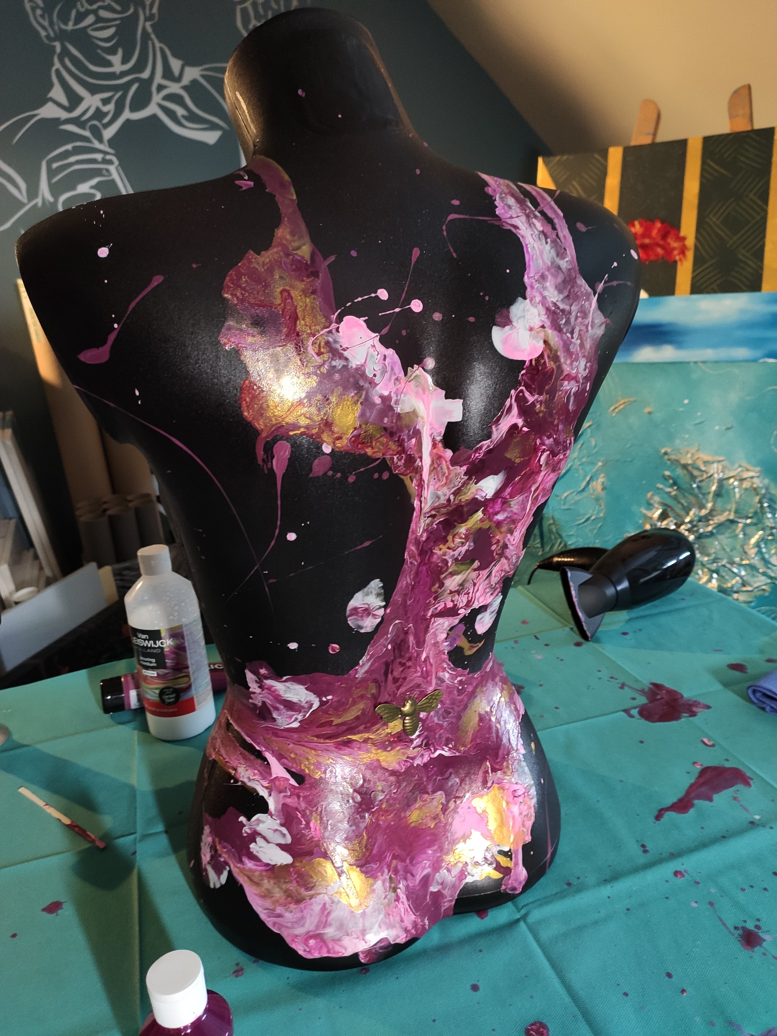 Après avoir repeint le fond de mes deux bustes en noir aux reflets rouges pour l’un et en noir aux reflets bleus pour l’autre, je m’attaque à la décoration du premier 💖.