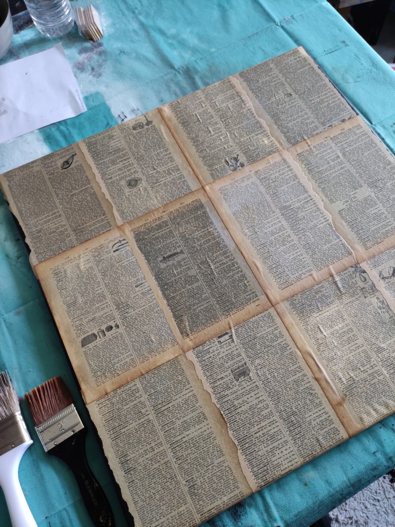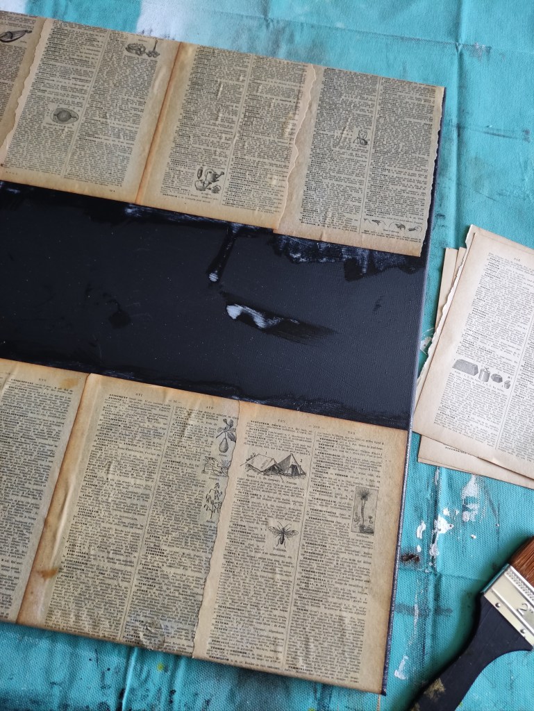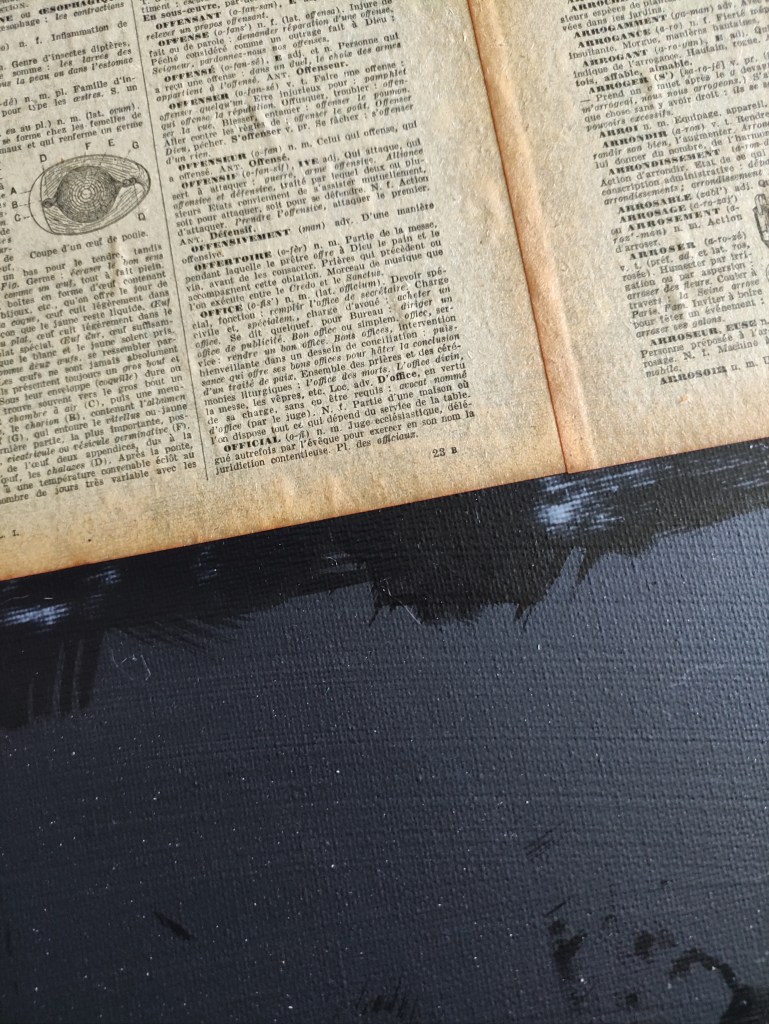 Je démarre une nouvelle toile ☺️. Le fond sera composé de feuilles d’un vieux dictionnaire Larousse du début 20eme.