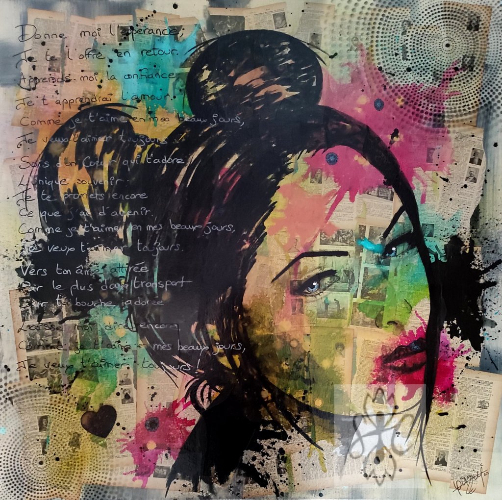 Le visage à été peint à l’encre de chine noire. J’ai ajouté des motifs au pochoir avant d’écrire un poème d’amour au Posca noir et crème.
