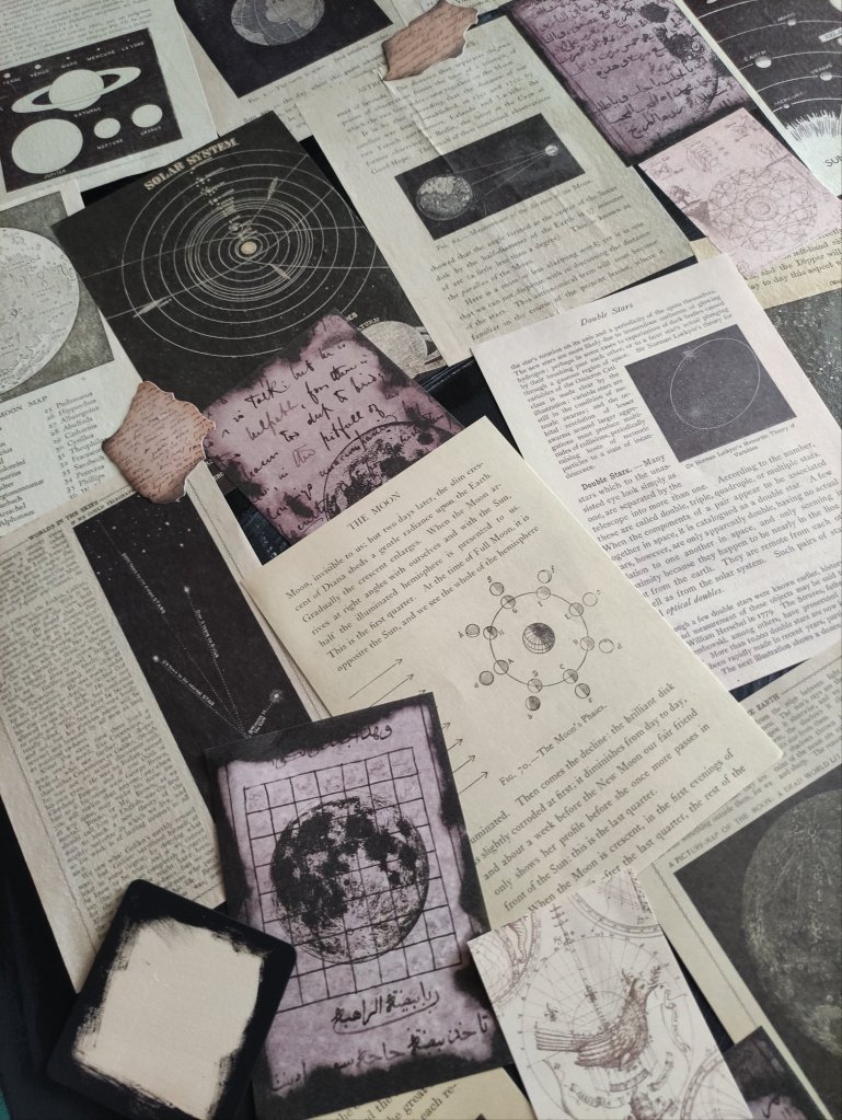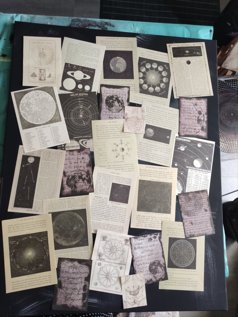 Démarrage du collage sur le thème de l’espace et du temps. J’espère que ça va le faire … Je teste des nouveaux papiers pour le fond… 🤪