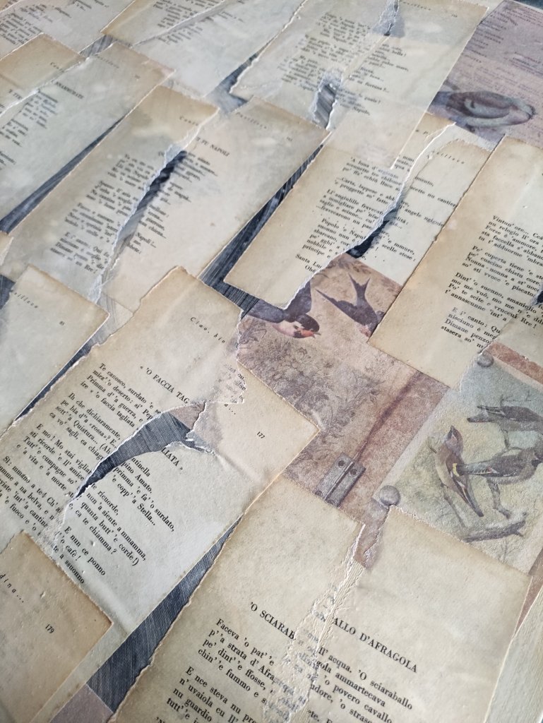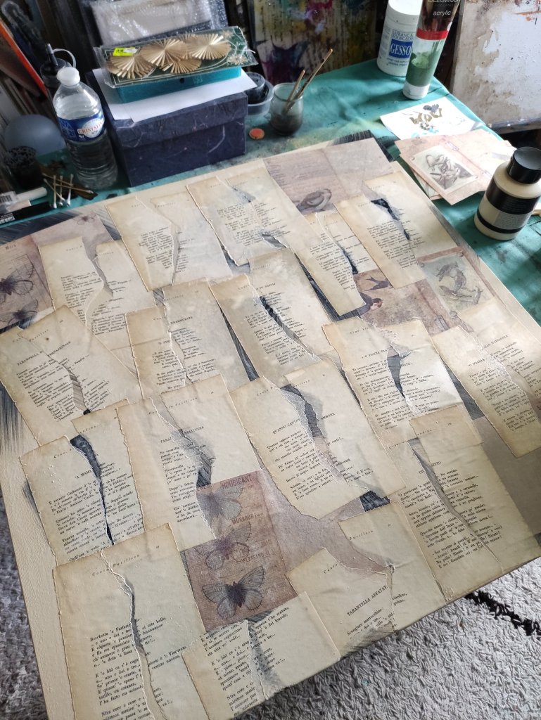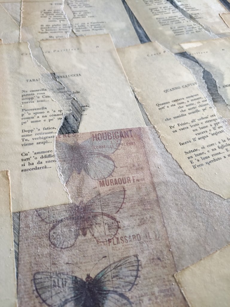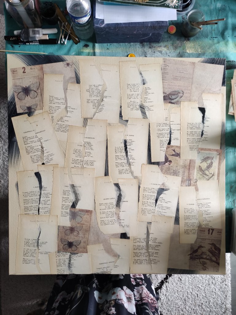 La sixième toile est bien partie 😊. Le fond est composé de collages de poèmes Italiens ainsi que de magnifiques images d’oiseaux et de papillons.