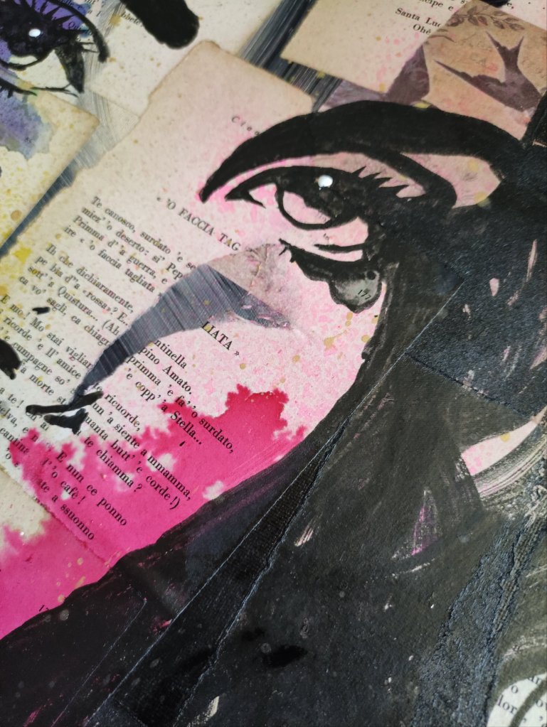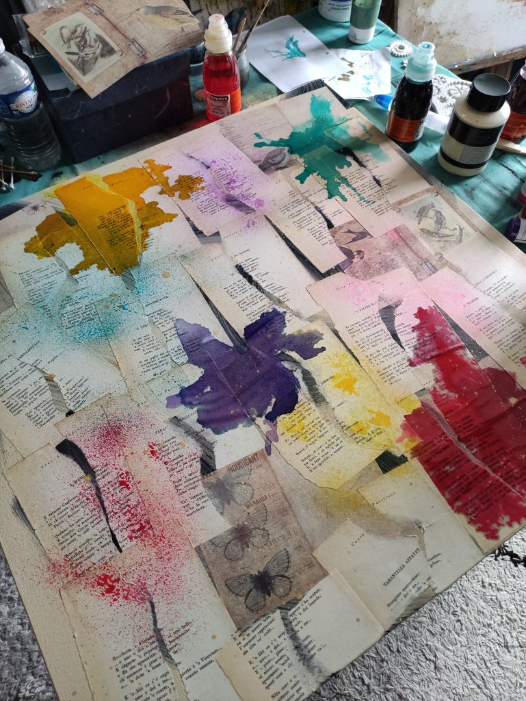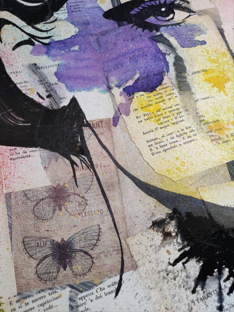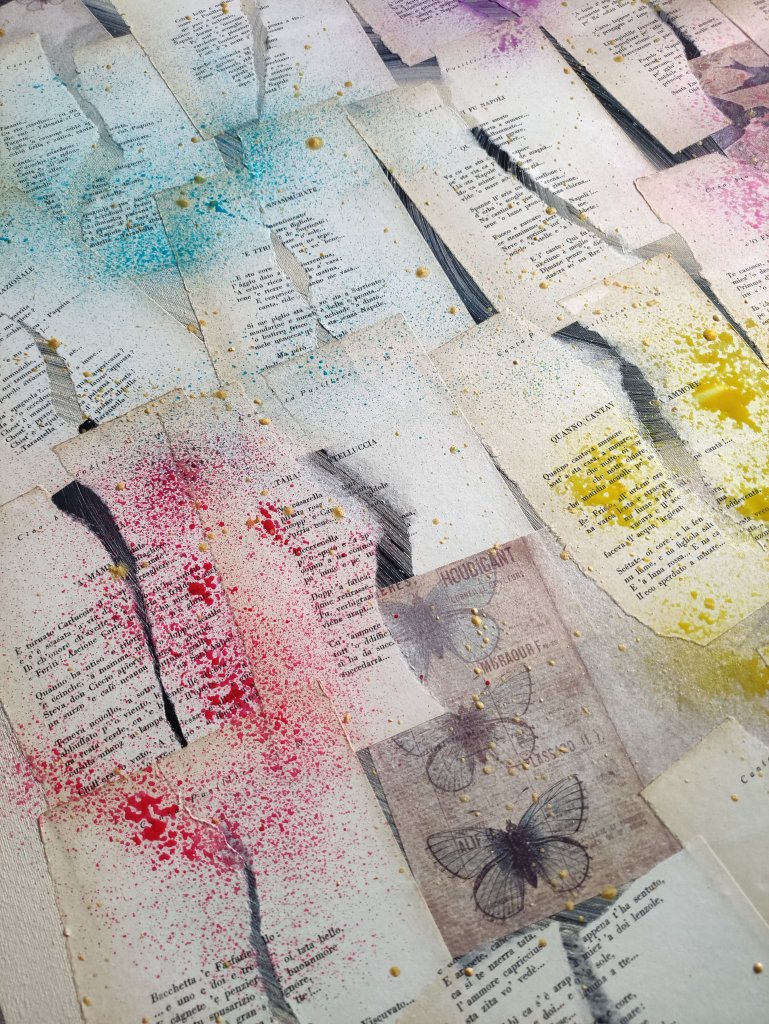 La sixième toile est bien partie 😊. Le fond est composé de collages de poèmes Italiens ainsi que de magnifiques images d’oiseaux et de papillons.
