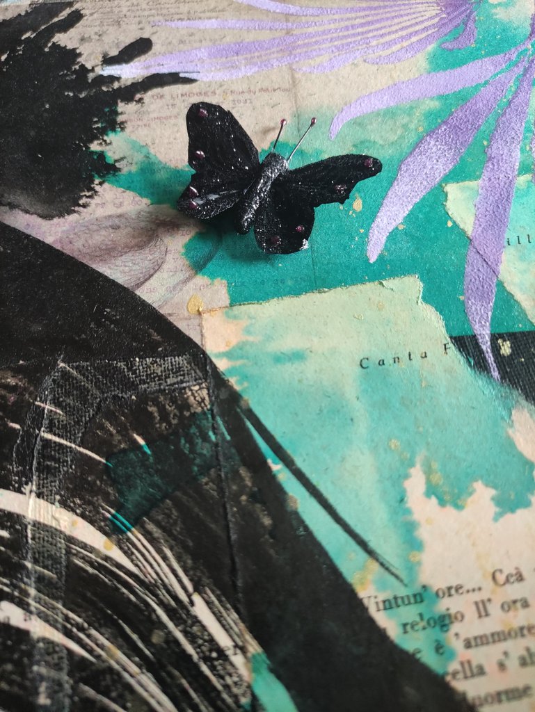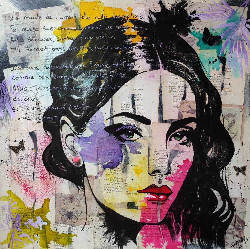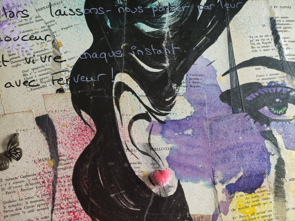 Sur fond de pages d’un recueil de poèmes Italiens, le visage de cette femme vient sublimer l’ensemble. Un court poème d’amour ajoute la touche finale.