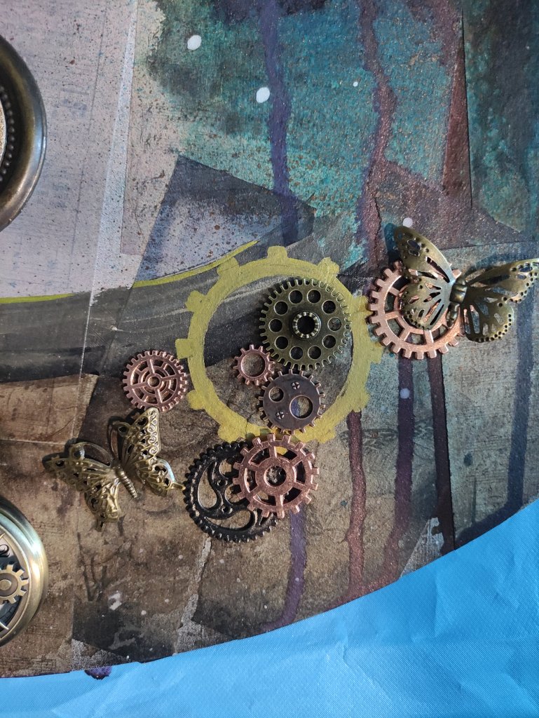 Quelques essais de placement des motifs métalliques avant passage du vernis.