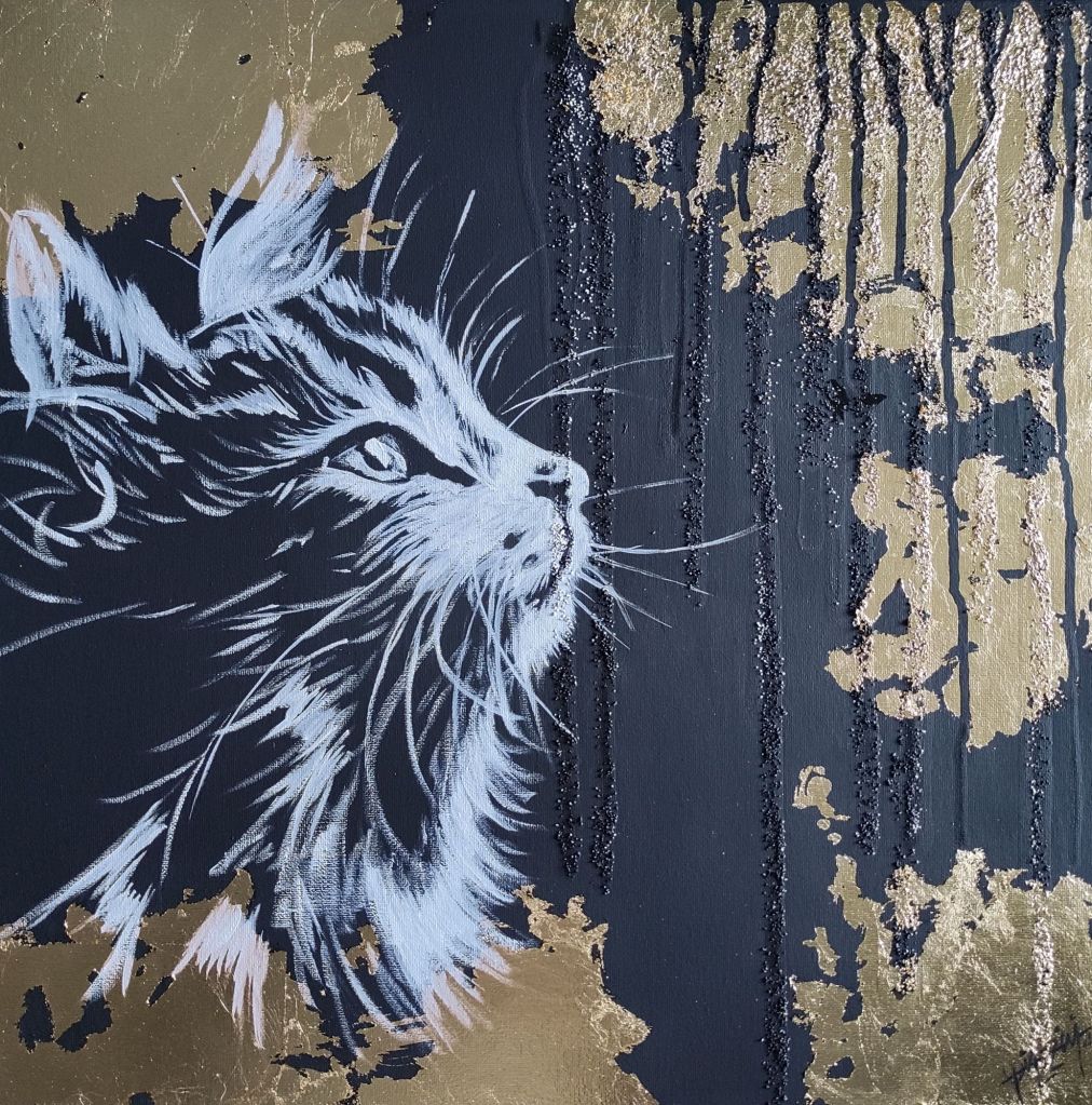 J’en ai déjà peint ou dessiné plusieurs et j’avais envie de me lancer dans une petite série avec comme première toile…. Un chat 😂