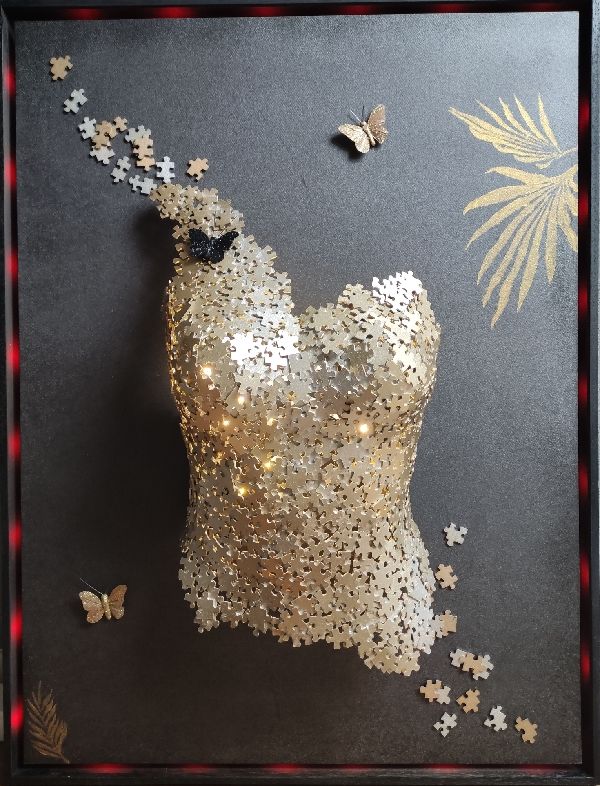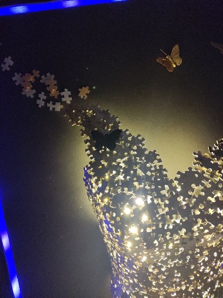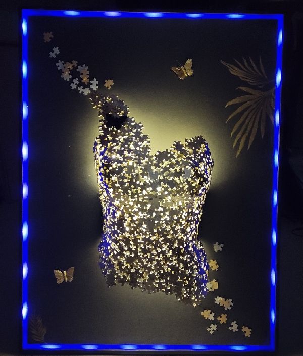 Pour un effet Waouh je positionne des rubans led sur la partie interne du cadre avant la mise en place du fond (avec couleur variable) ainsi que dans le buste (lumière blanche chaude) une fois celui-ci collé.