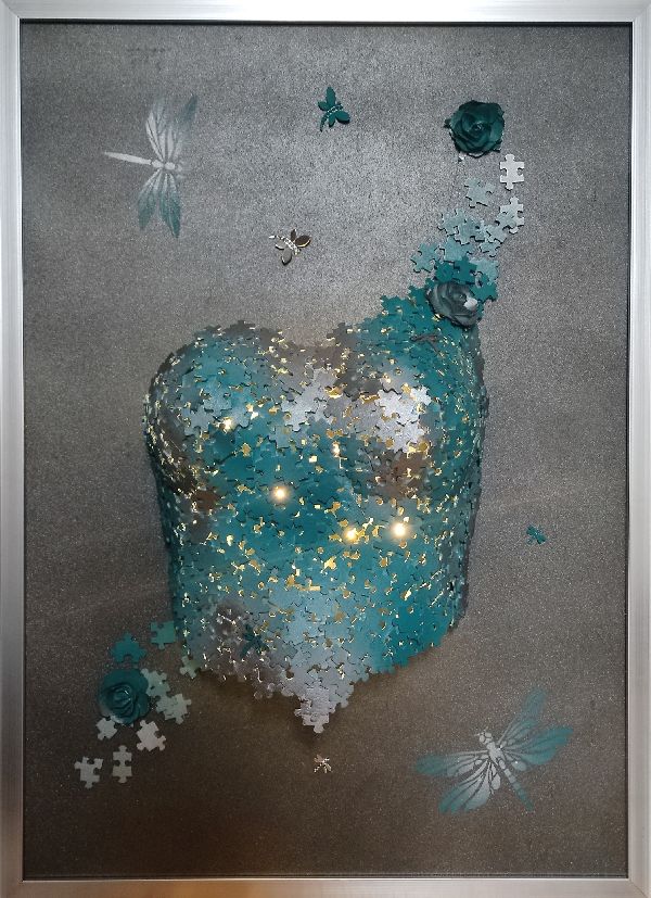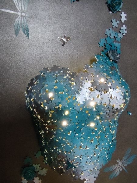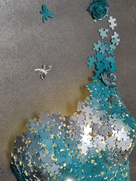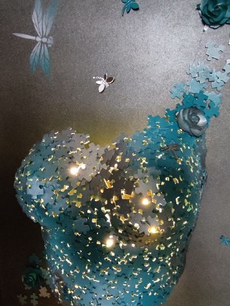 Le buste a été lui aussi confectionné en pièces de puzzle mais cette fois-ci la mise en couleur a été faite en chrome et bleu.