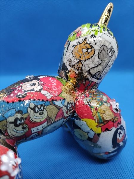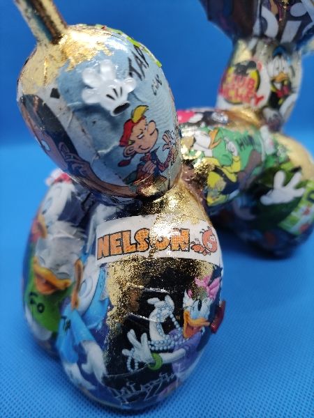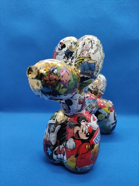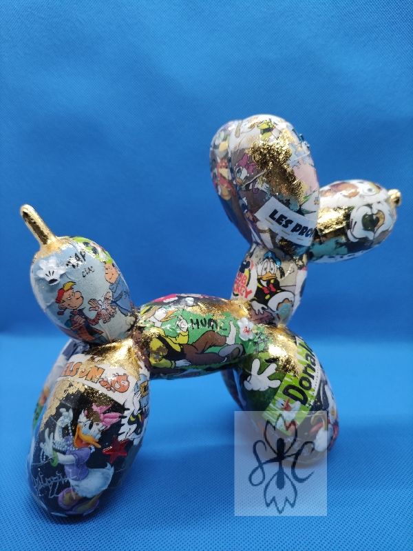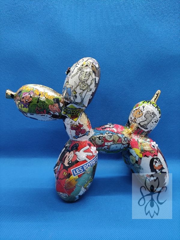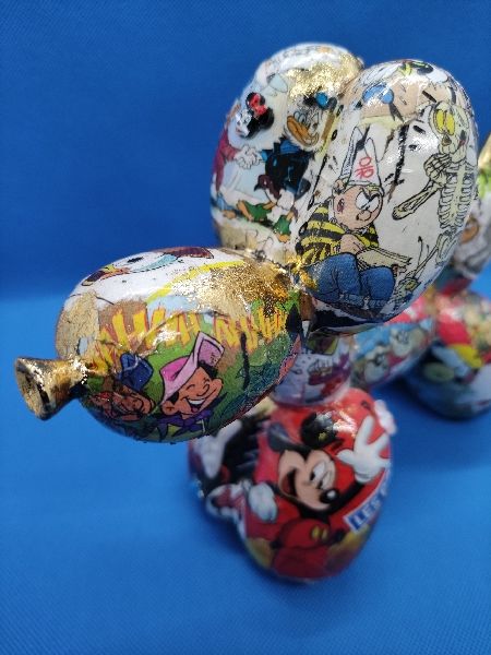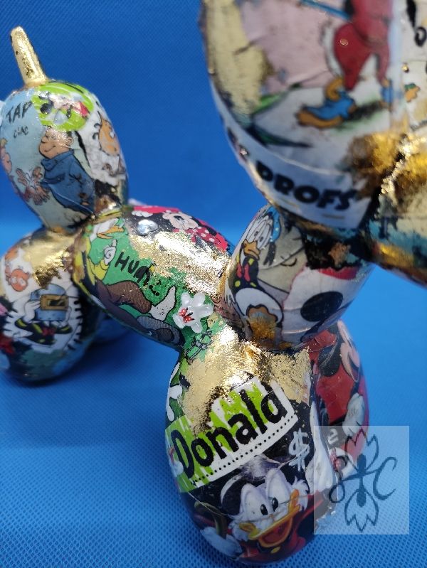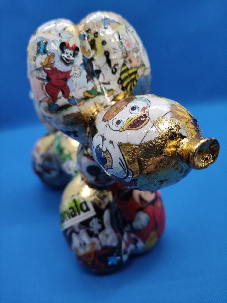 « M and Co » : Chien ballon en résine customisé au posca, feuilles à dorer et par collage sur le thème de la célèbre souris et de ses amis. Quelques éléments surprise en reliefs 😉. Toujours dans l’esprit Pop Art.