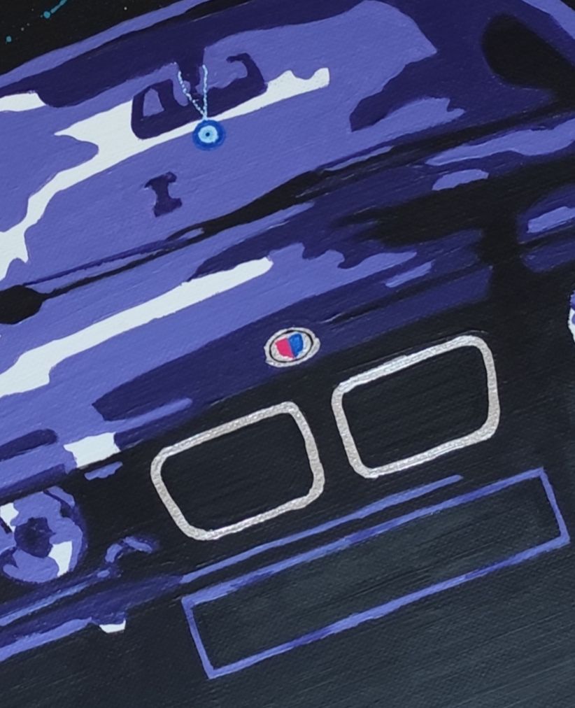Peinture acrylique sur toile coton 70x50cm. Ajout de feuille argentée sur la calandre et le logo du capot.