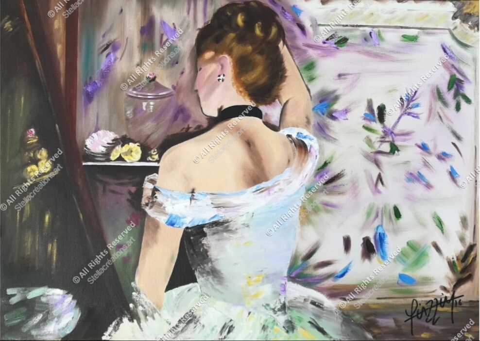 Reproduction et interprétation d’après une œuvre de B. Morisot: « Jeune femme de dos à la toilette » Huile sur toile 50×70 Envoi OFFERT sous 5 jours ouvrés.