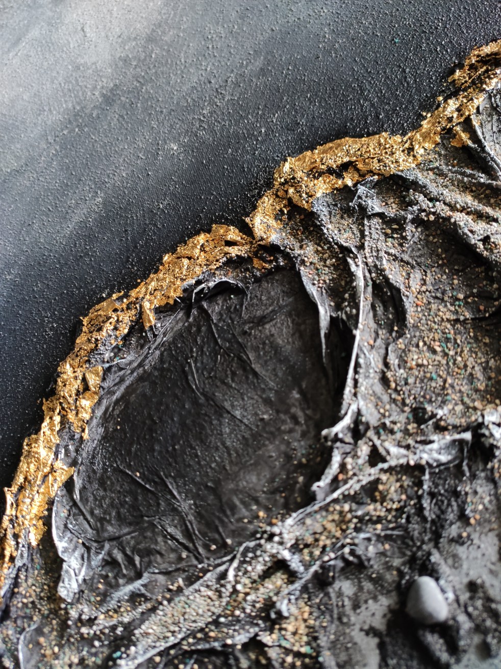 Voilà... J'ai fini ma dernière toile. Plus sombres que les précédentes mais ainsi va la vie... Elle reflète mon état d'esprit du moment comme souvent chez les artistes non? Une touche de lumière et d'espoir dans la noirceur du monde avec cette ligne d'or qui fend les ténèbres. Réalisé en technique mixte (peinture acrylique, sable,… Lire la suite « Terre Noire » le final
