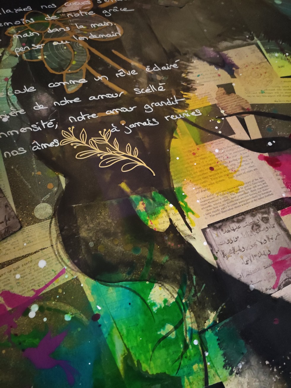 Voilà voilà... Il est fini. Résumons: Préparation du fond au gesso noir Collage de pages de dictionnaire de 1948 pour une touche de vintage 😉. Ce dictionnaire a vécu et raconte une histoire... J'adore ☺️ Masquage des mots qui composeront la citation avec de la gomme à aquarelle. Création d'un fond coloré avec des taches… Lire la suite « L’amour et la vie »#1 final