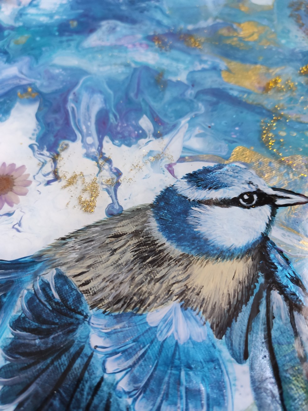 Dernière coulée de résine époxy afin d'égaliser la surface de la toile. Des inclusions de fleurs séchées, de motifs en métal et de paillettes blanches et dorées ont été ajoutées lors de la première coulée. Petit montage du rendu final 😉