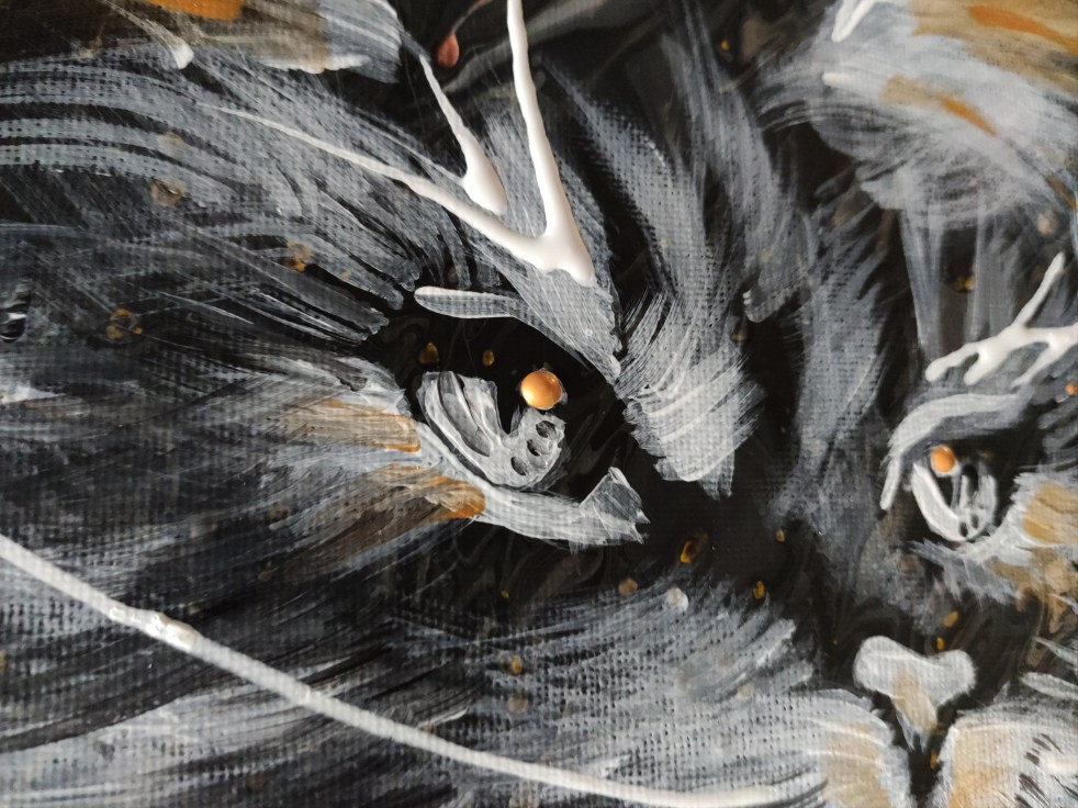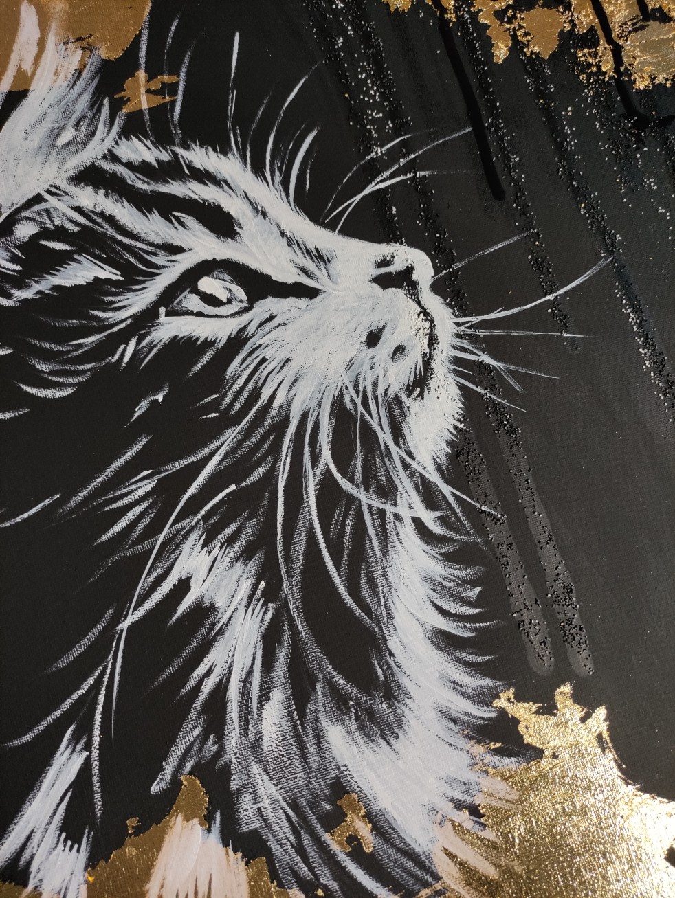 Sur un fond réalisé à la peinture fluide acrylique (pouring) dans des tons sobres et doux (noir, ocre jaune, blanc et or). Après séchage complet du fond, le motif du chat est réalisé à main levée à la peinture blanche avec quelques touches de doré. 😉🐈