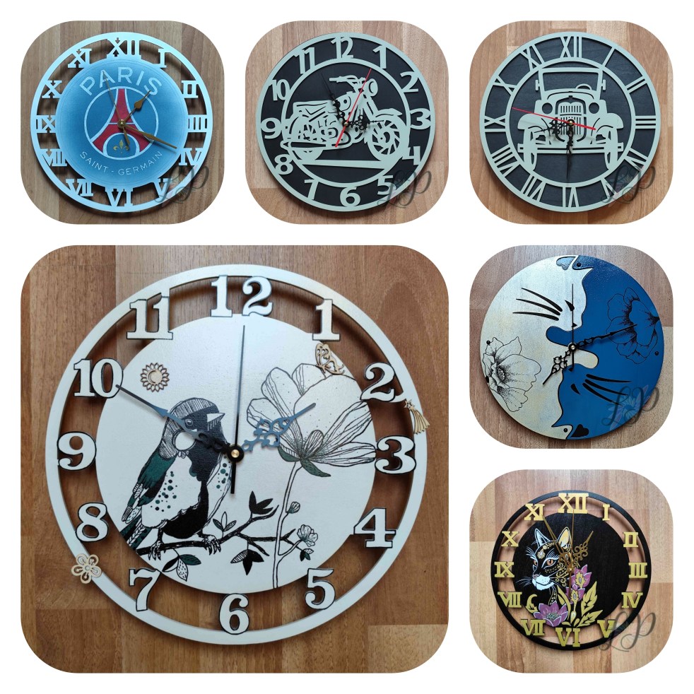 Récapitulatif des horloges disponibles. Ce sont toutes des pièces uniques ❤️❤️. Des variantes peuvent être réalisées sur commande bien-sûr ! Diamètre d'environ 28cm. Le support est réalisé en découpe laser. Motifs en diverses techniques selon le thème. https://videopress.com/v/gy1n89mE?resizeToParent=true&cover=true&preloadContent=metadata&useAverageColor=true